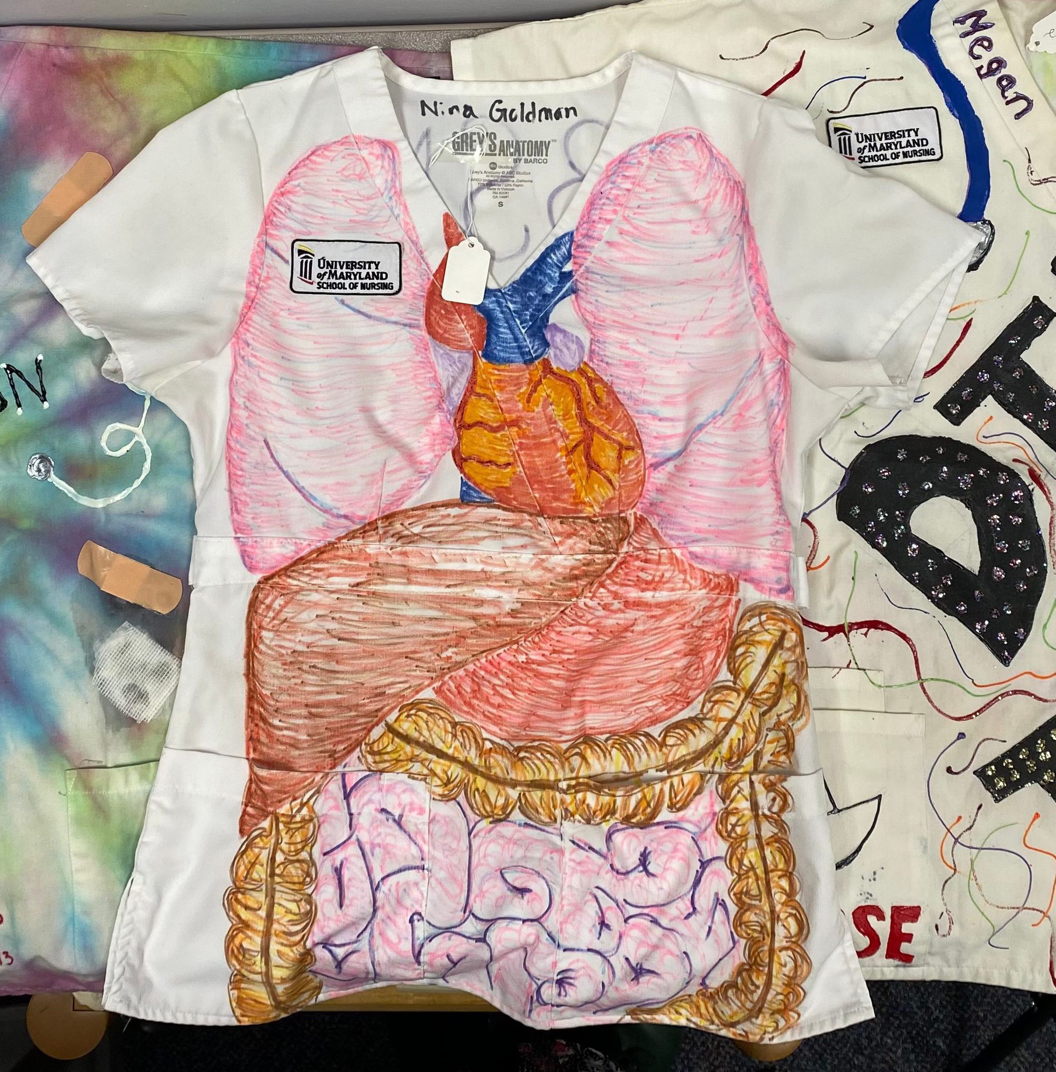 White student scrub shirt with University of Maryland School of Nursing patch on proper right chest. Scrub is decorated with a multi-color anatomical drawing of the internal torso organs, lungs, brochii, heart, liver, stomach, large and small intestines. "Nina Goldman" in black marker at CB neck. Decorated by Nina Goldman, BSN 2013 as part of the "stringing of the scrubs" graduation celebration.Collection