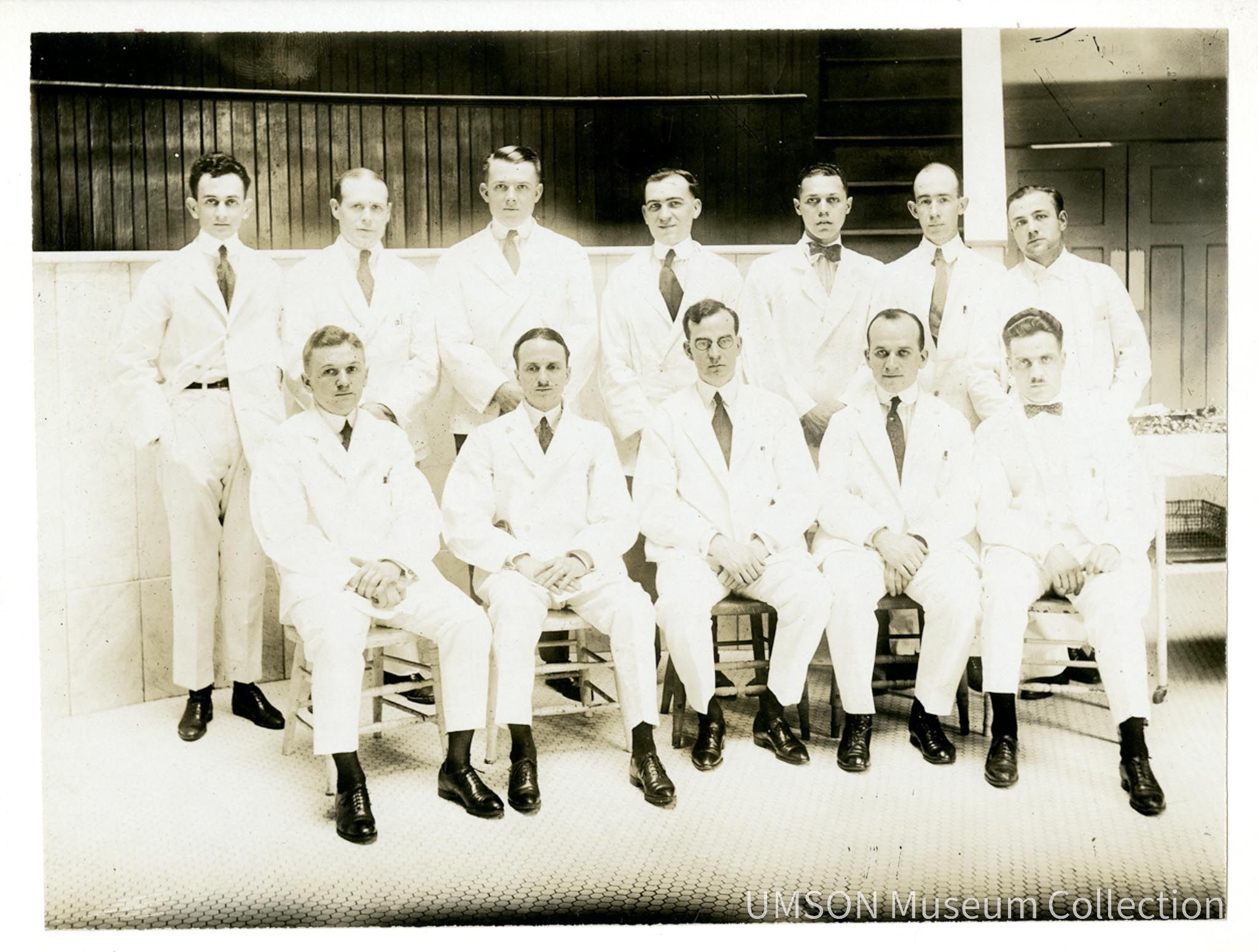 Twelve men in white lab coats and trousers sit and stand in two rows in the University Hospital, Maryland surgical ampitheatre. Partially identified on verso: Front row- ?, Hundley- Riefschneider- Stimm- Johns- Willet-? Bottom row: Honne- Geyer- Duncan- Buhnens- GoldsboroughPhotograph Details
