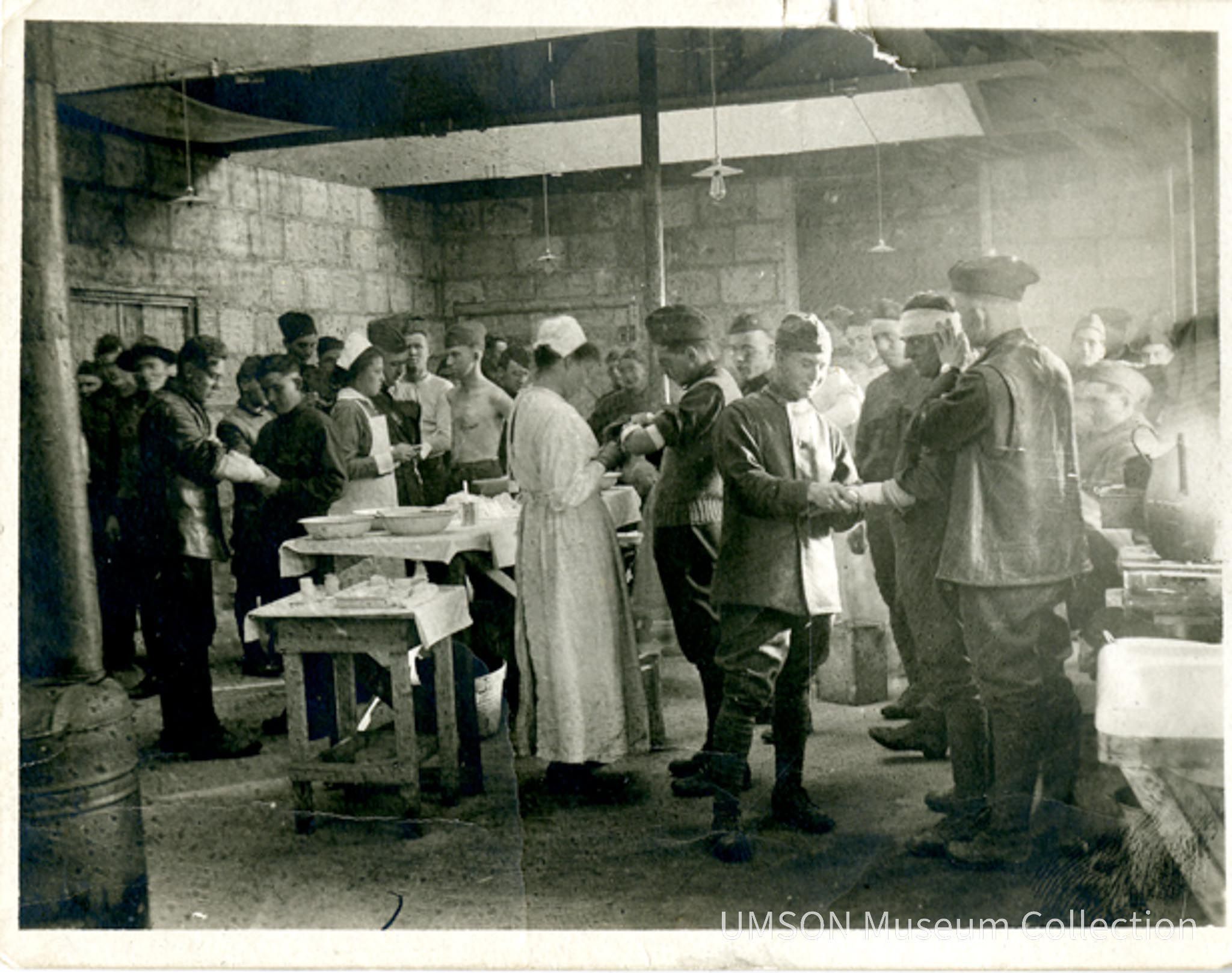Interior view "ambulance clinic" or casualty clearing station in France, 1918 (probably Saveray). Uniformed soldiers are attended by corpsmen and nurses in a stone-walled room with wooden tables of instruments and bandages; a metal stove is in the left foreground.Photograph Details