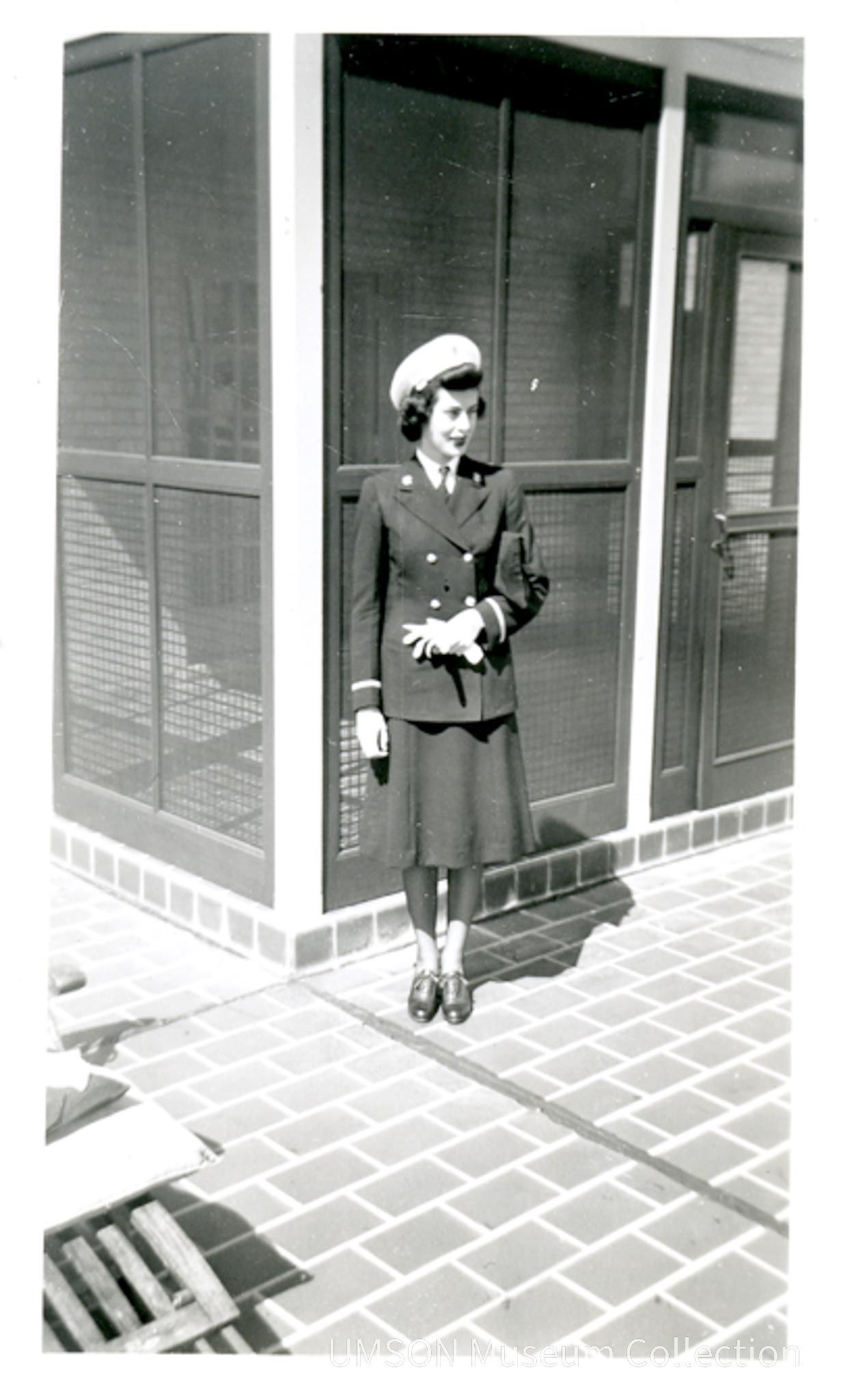 Jane Small Baker (DIN 1942) in U.S. Army Nurse Corps dress uniform standing in front of a screened porch.Photograph Details