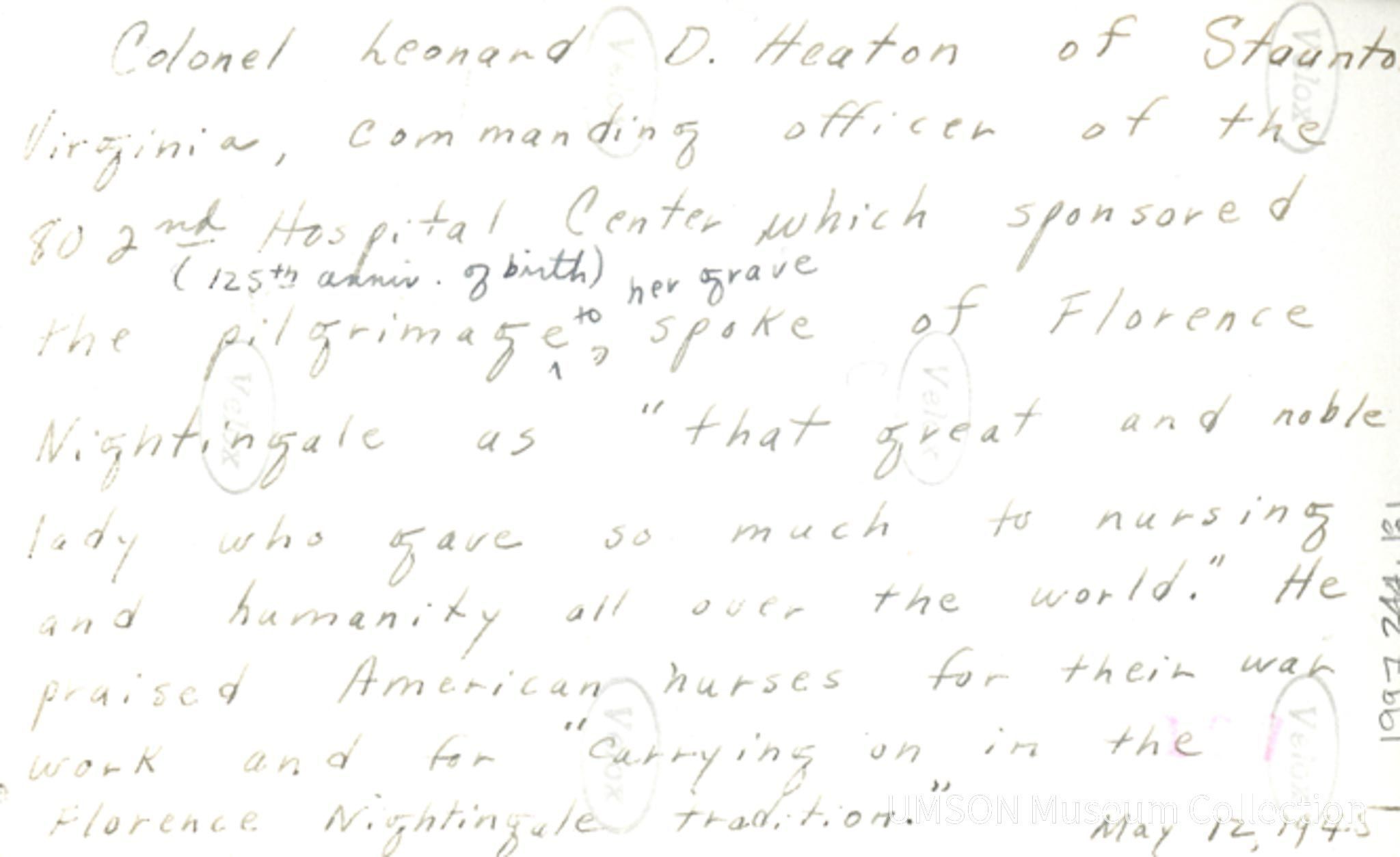 Colonel Leonard D. Heaton of Staunton, Virginia, commanding officer of the 802nd Hospital Center, which sponsored the pilgrimage (125th anniv. of birth), ^ to her grave spoke of Florence Nightingale as "that great and noble lady who gave so much to nursing and humanity all over the world." He praised American nurses for their war work and for "carrying on in the Florence Nightingale tradition." May 12, 1945Language