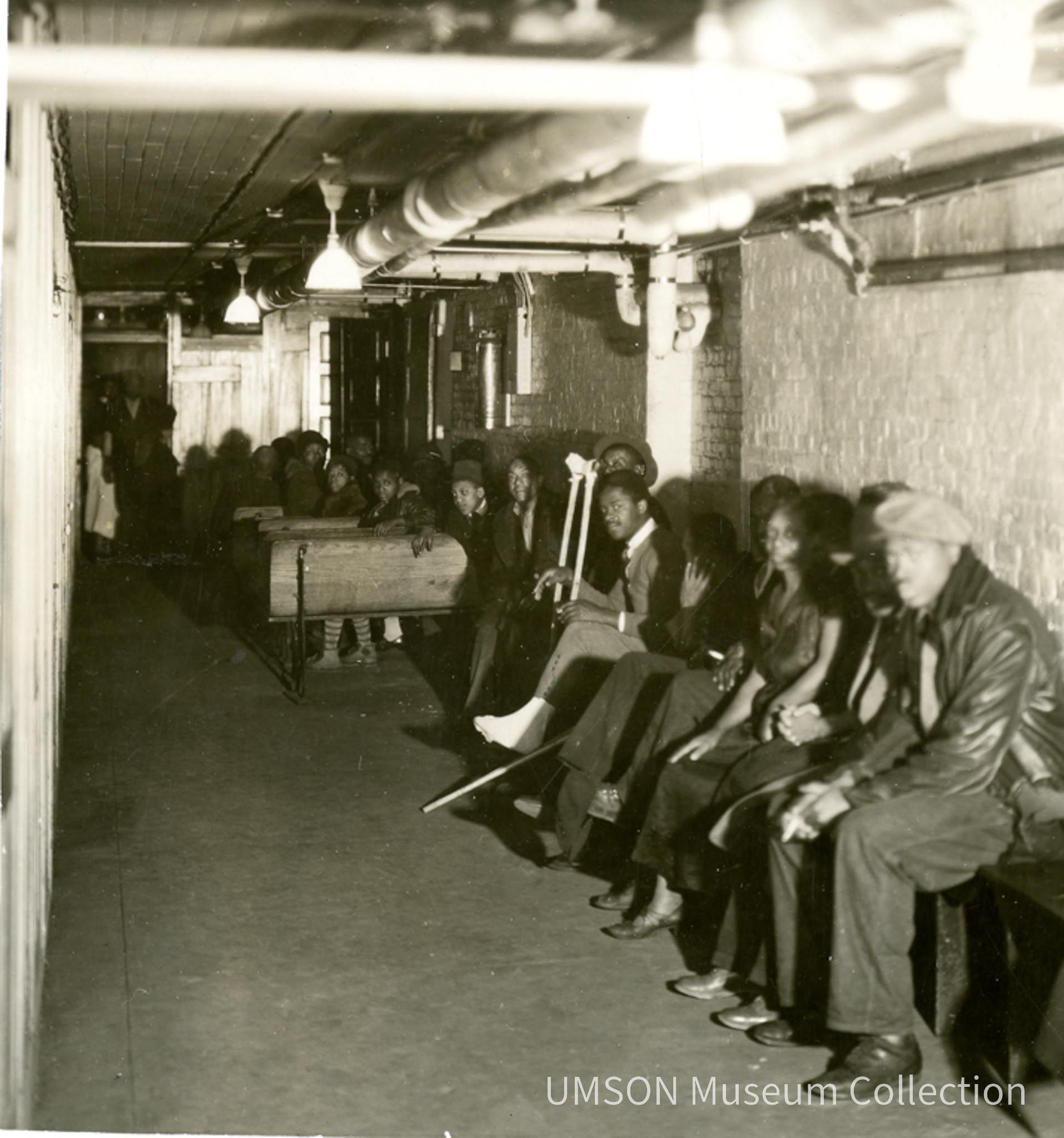 Black patients sitting on wooden benches in a basement hallway, segregated outpatient clinic, University Hospital, Maryland, 1934Entry/Object ID