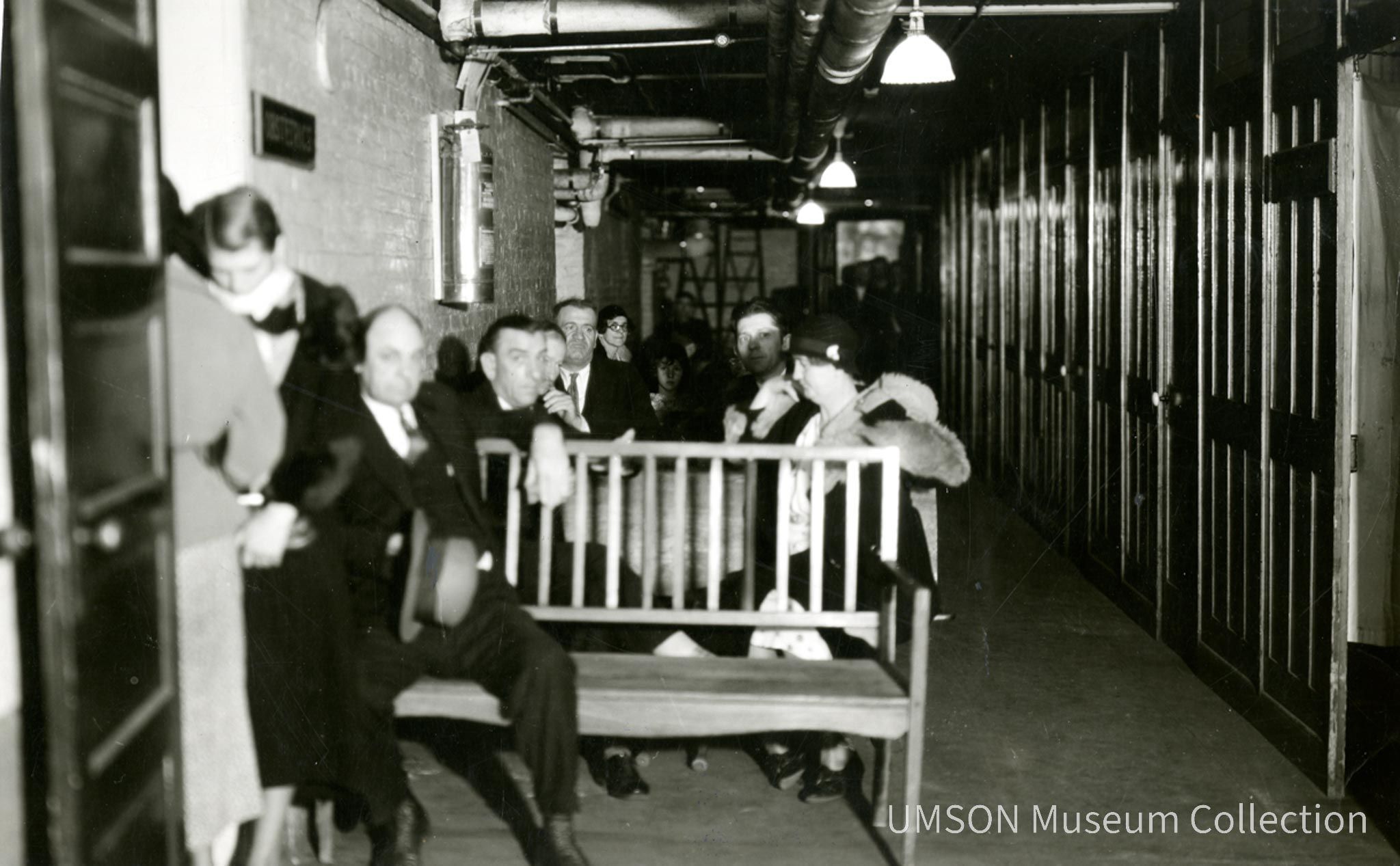 White patients sitting on wooden benches in a basement hallway, segregated outpatient clinic, University Hospital, Maryland, 1934Entry/Object ID