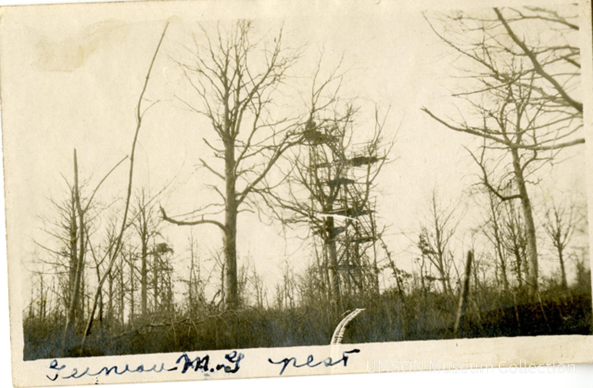 Platforms connected by ladders are visible in a leafless tree. A note in ink at the bottom of the image reads "German M. G. nest"Photograph Details
