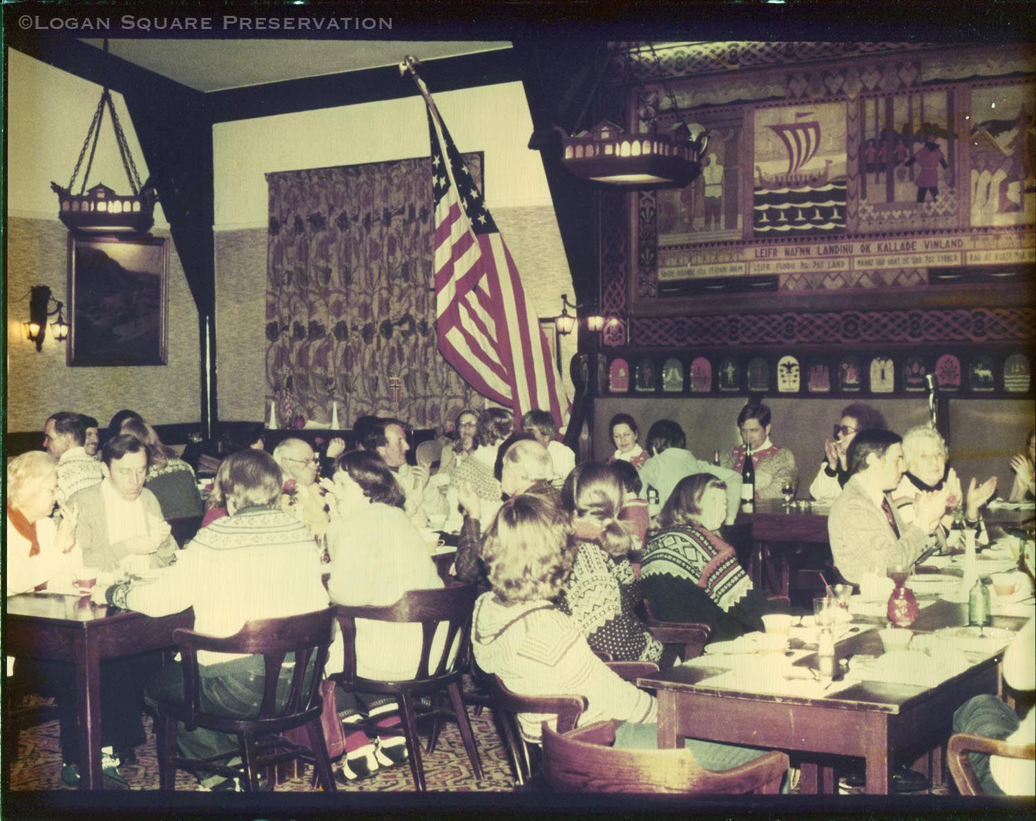 Photograph of diners wearing lusekofte sweaters at ski club lapskaus (stew) dinner organized by Bjørnsterne Björnson Lodge held in in Norske Klub banquet hall, winter 1979Photograph Details