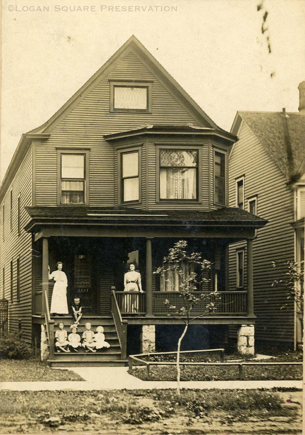 Photograph of frame single-family home at 2231 N. Monticello Ave with two women on porch (likely Josephine Nelson) and five children sitting on stairs, circa 1910sPhotograph Details