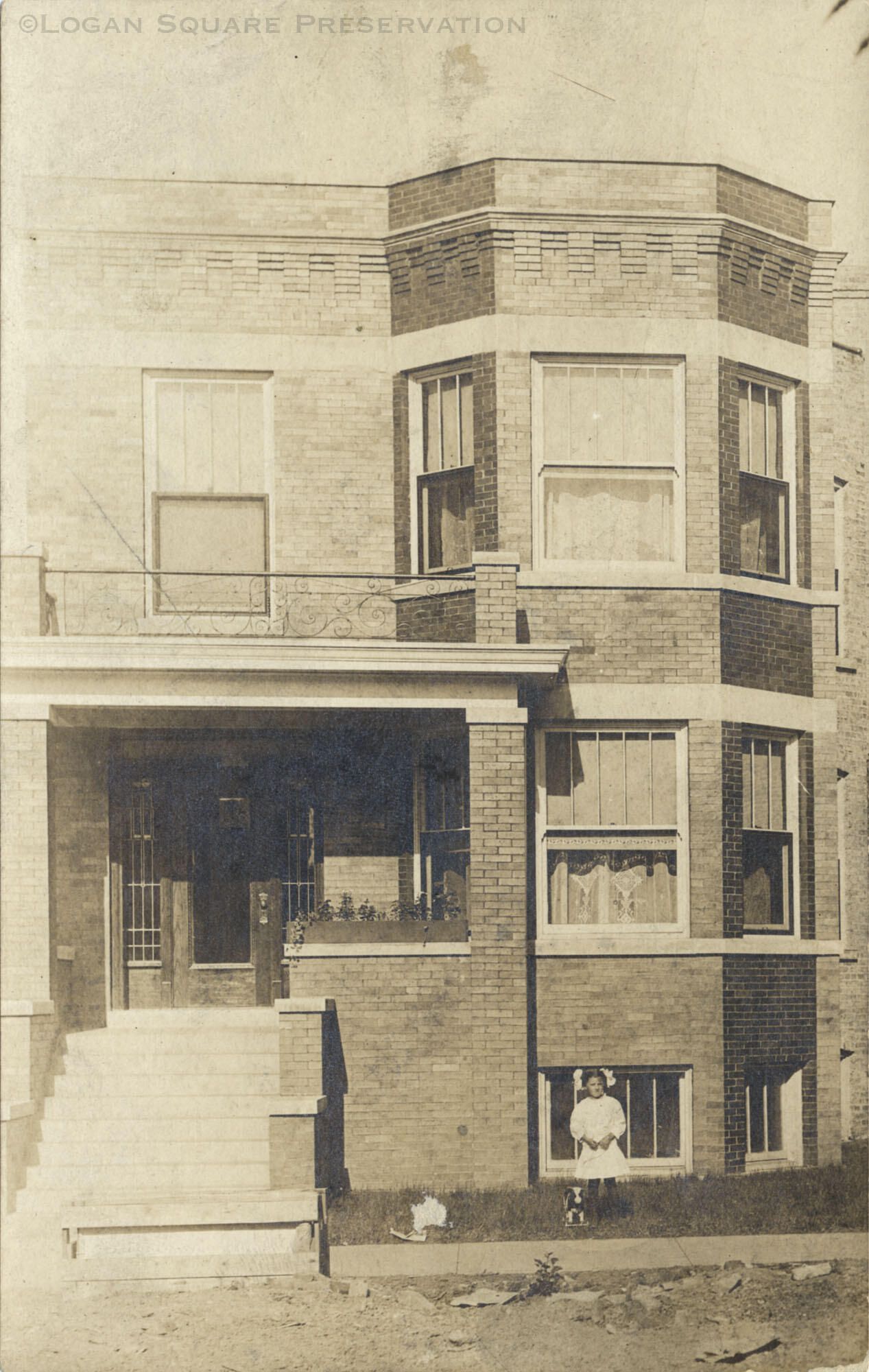 Real-photo postcard view of small girl in front of brick two-flat at 2339 N. Springfield Ave., sent by G.N. Reel, circa 1910Subject