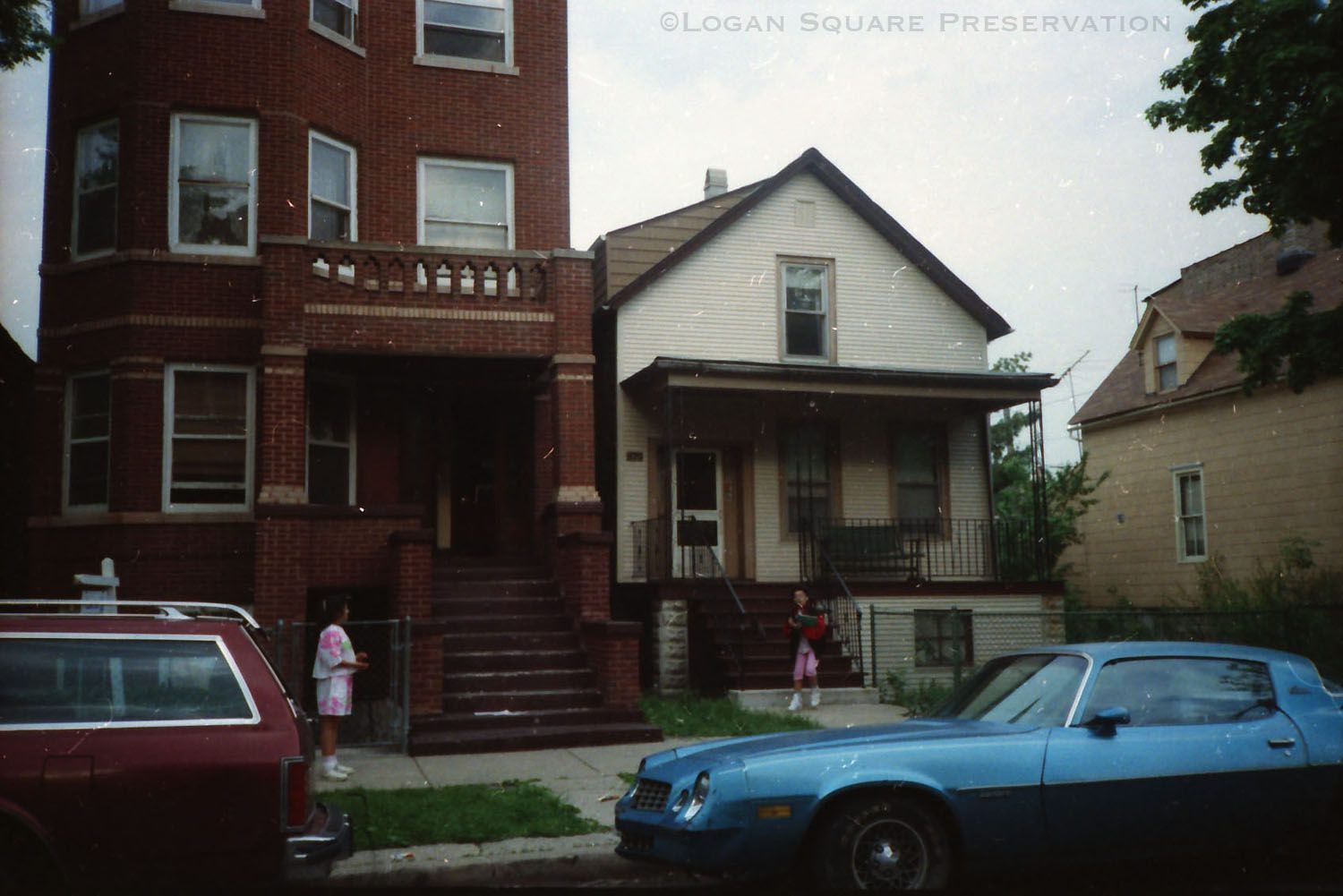 Color slide image of children on sidewalk in front of brick 3-flat and frame workers cottage behind parked cars on 2400 block of N. Washtenaw, circa 1980sPhotograph Details