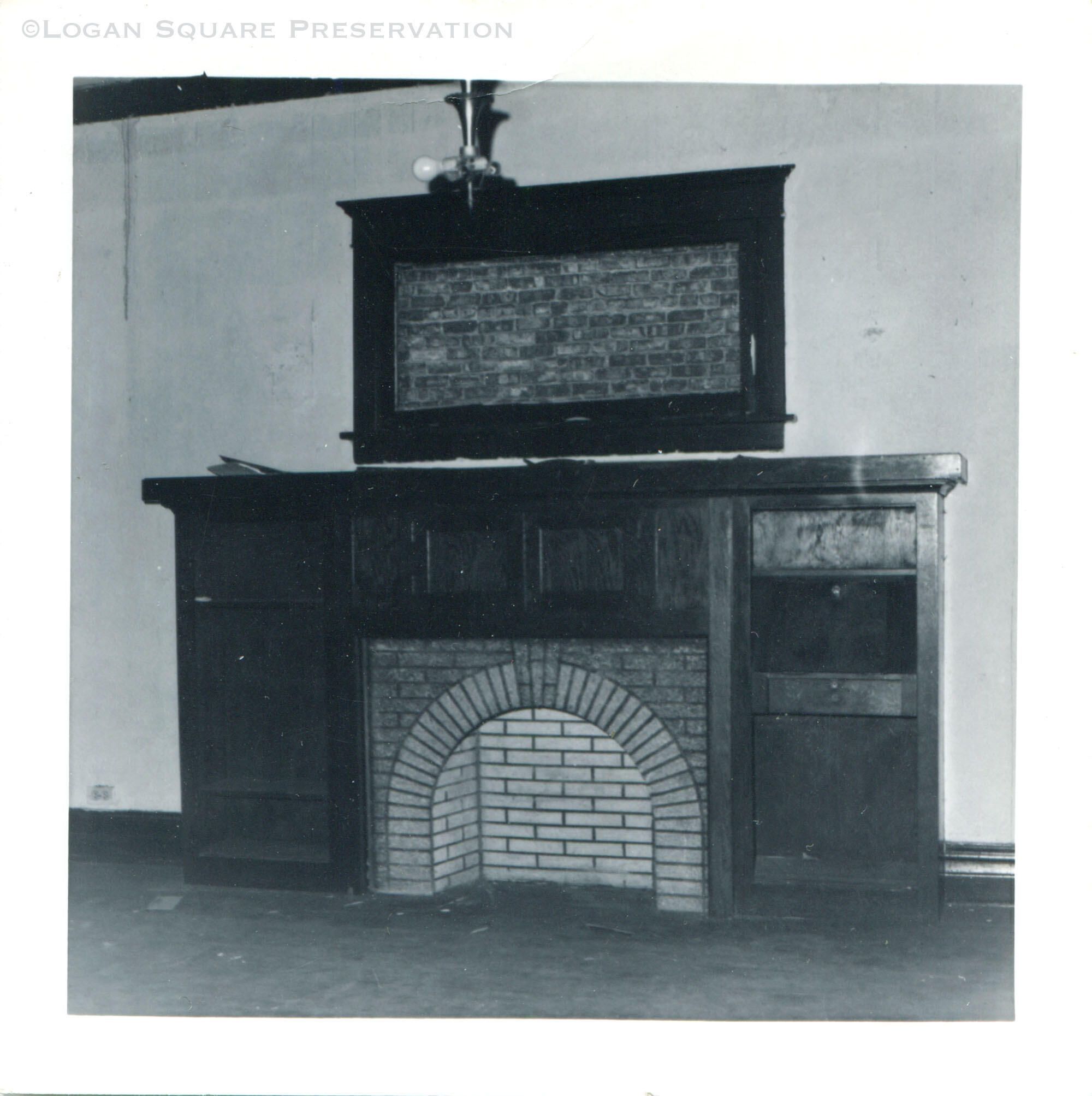 Photo view of brick fireplace and built-in bookcases at 2505 N. Central Park Ave, circa 1974Photograph Details