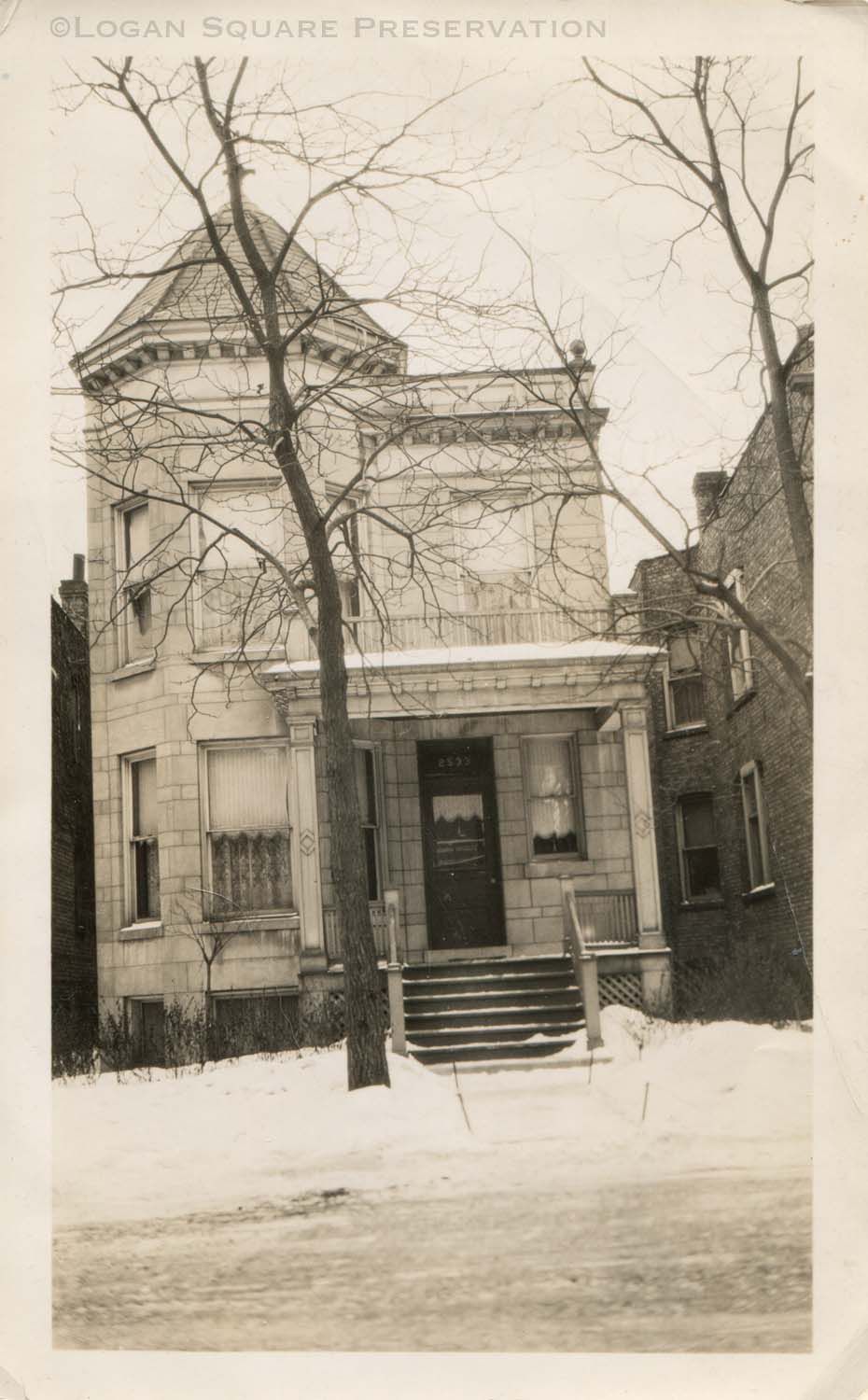 Snapshot view of front of greystone two-flat from across street on snowy winter day, circa 1930s-1940sPhotograph Details