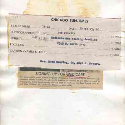 Form B-19 Chicago Sun-Times Film Number 11-12 Date March 29, 66 Photographer Bob Kotalik Subject Medicare nearing deadline Location 2345 W. North Ave. Caption (Names L. To R.) Mrs. Rose Deering, 65, 2639 N. Mozart. In a contemplative mood, these Chicagoans signed up for medicare's supplemental benefits Tuesday. Thursday is the deadline for persons 65 and older to enroll in the program. At the Social Security office at W. North. are Mrs. Rose Deering (left), 65, and Ollie Williams, 80.