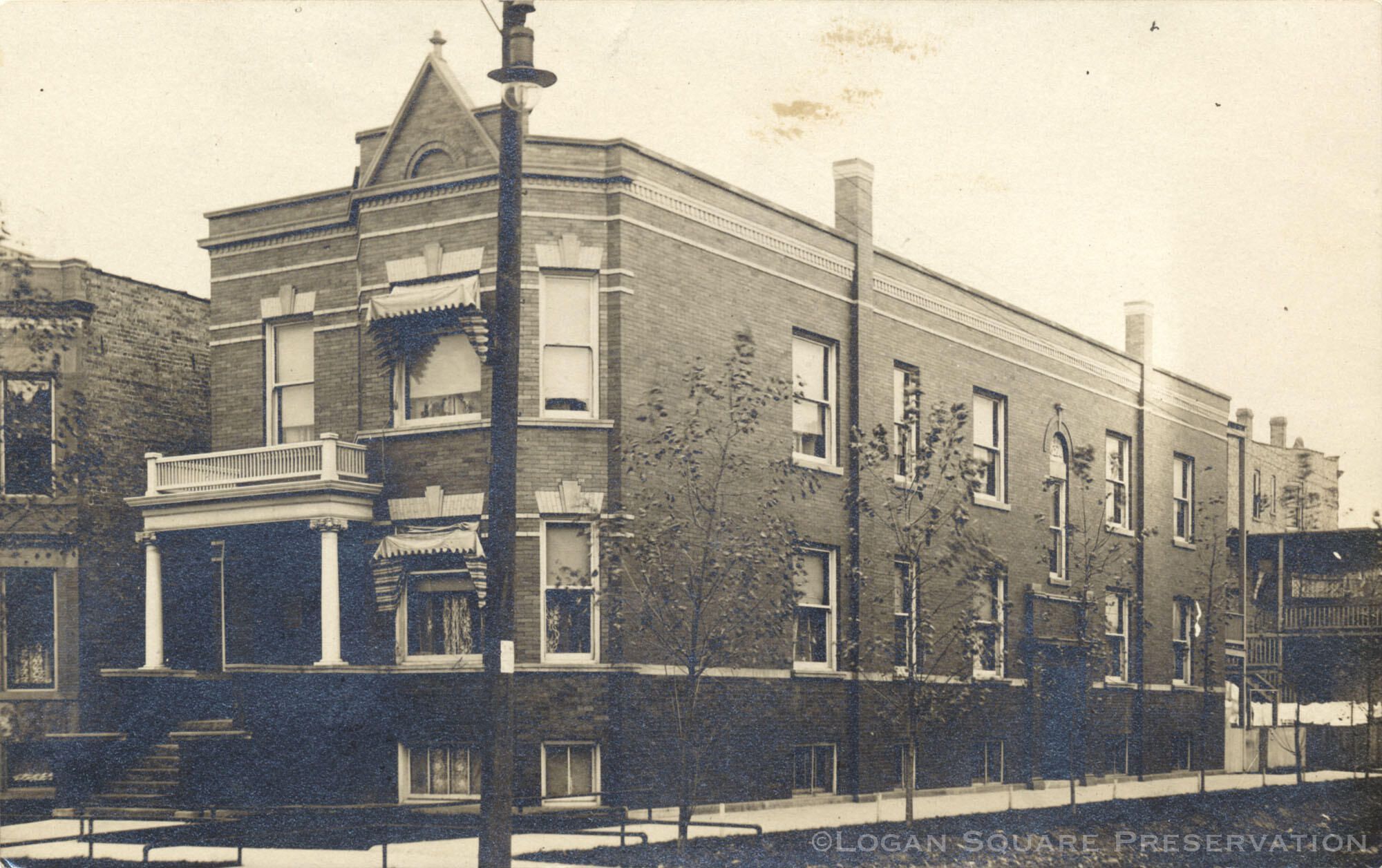 Real-photo postcard view of corner apartment building at 2648 N. Troy St, circa 1908Subject