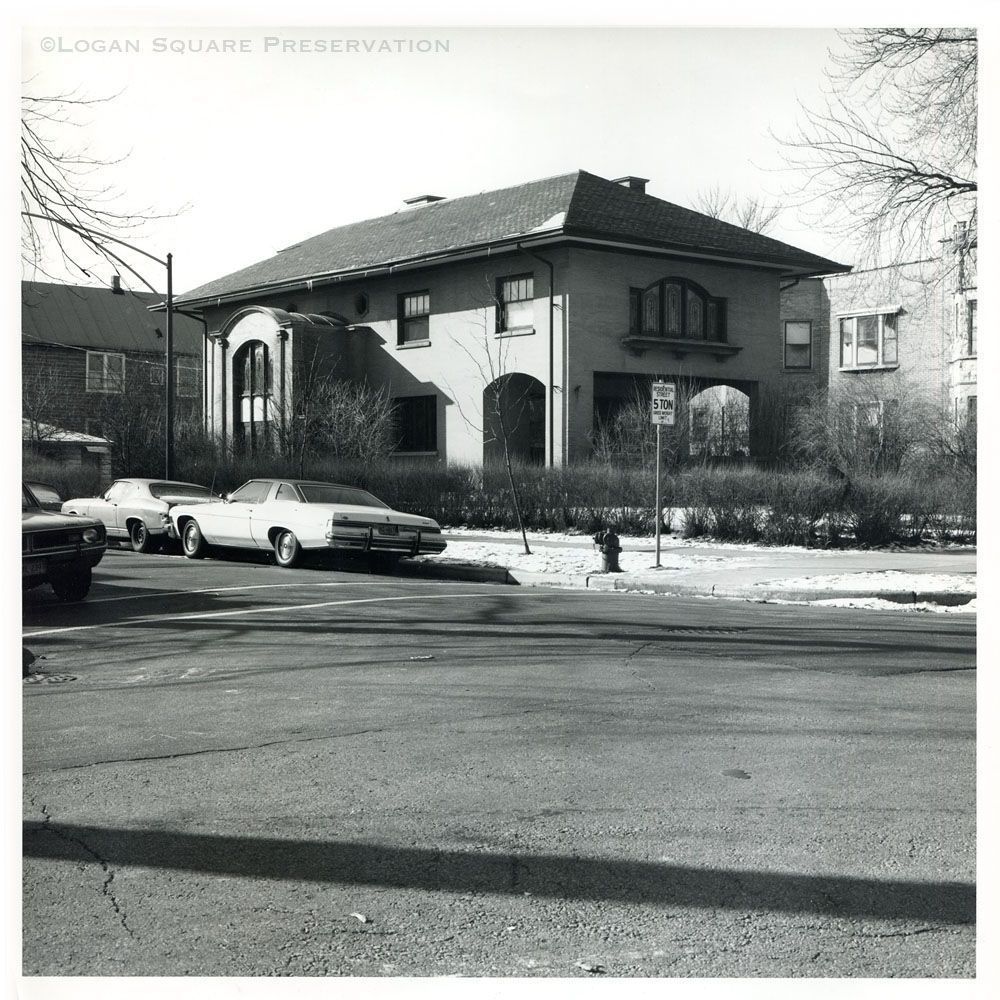 Enlarged print looking southwest from Logan Boulevard at 1907 Prairie-style house designed by architect George W. Maher for John Rath family, on sunny winter day, circa mid-1970sPhotograph Details