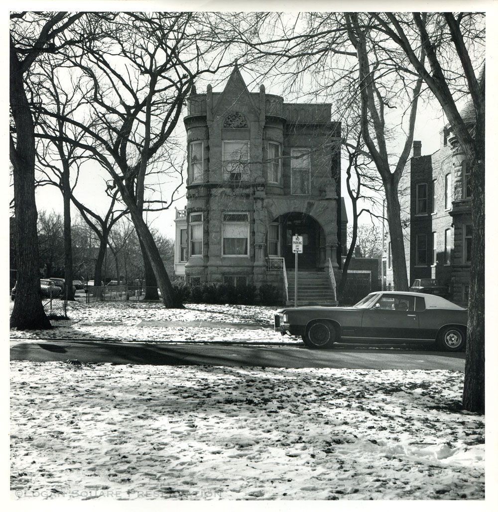 Enlarged print looking south across Logan Boulevard at greystone house at 2735 W. Logan with car parked in front on winter day, mid-1970sPhotograph Details