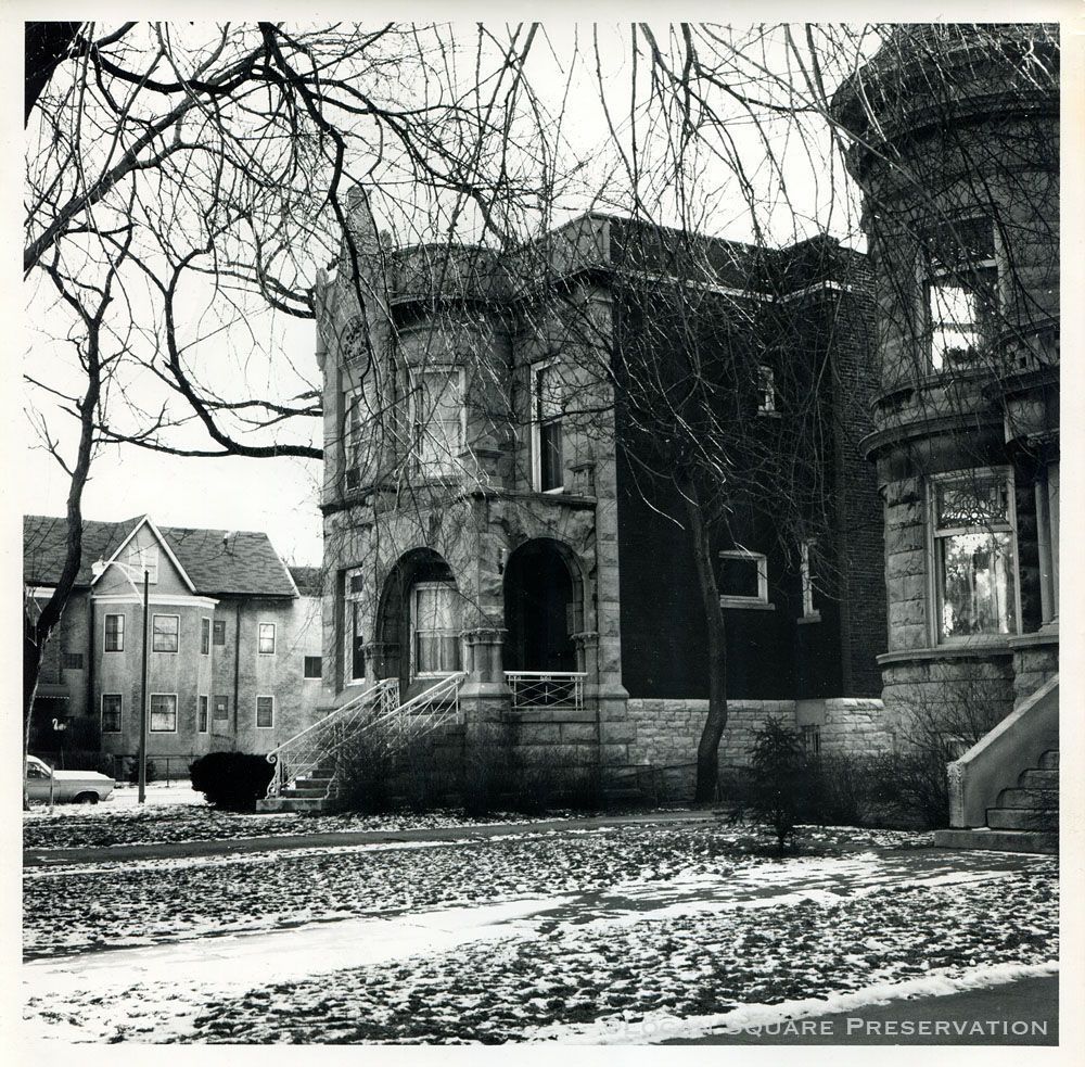 Enlarged print looking southeast at greystone front of house at 2735 W. Logan from sidewalk on winter day, circa mid-1970sPhotograph Details