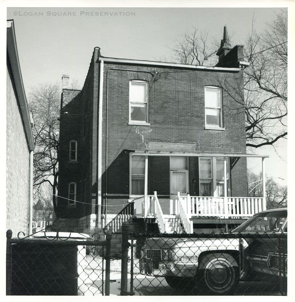 Enlarged print looking north at rear of house at 2735 W. Logan from alley on sunny winter day, circa mid-1970sPhotograph Details