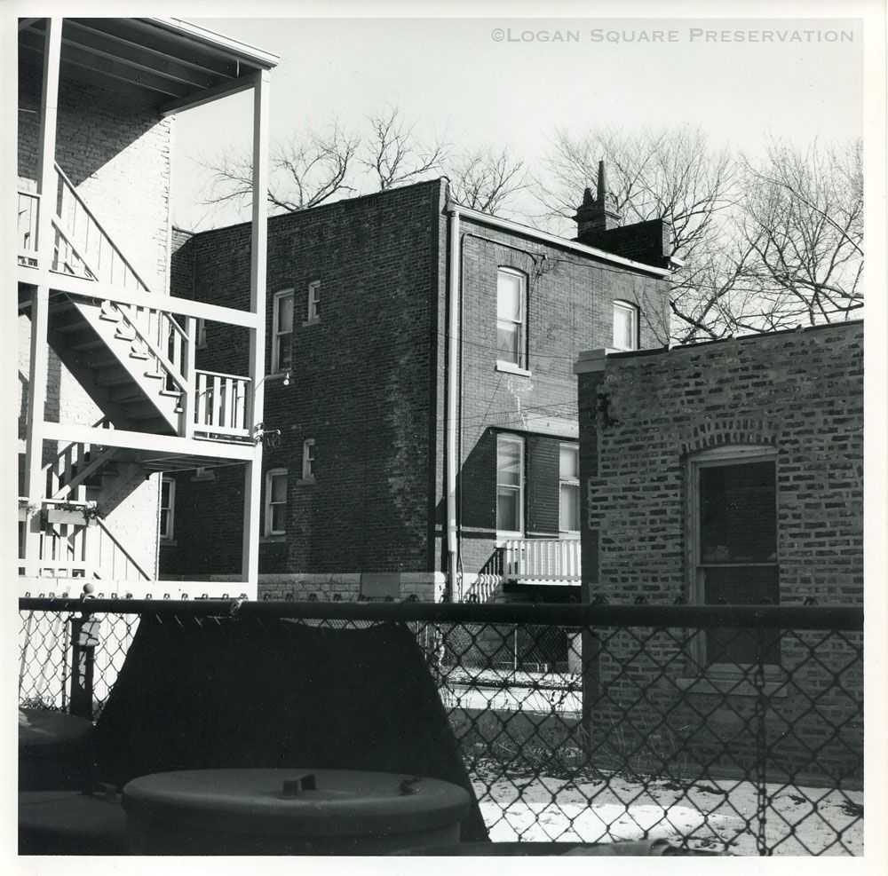 Enlarged print looking northeast at rear of house at 2735 W. Logan from alley on sunny winter day, circa mid-1970sPhotograph Details