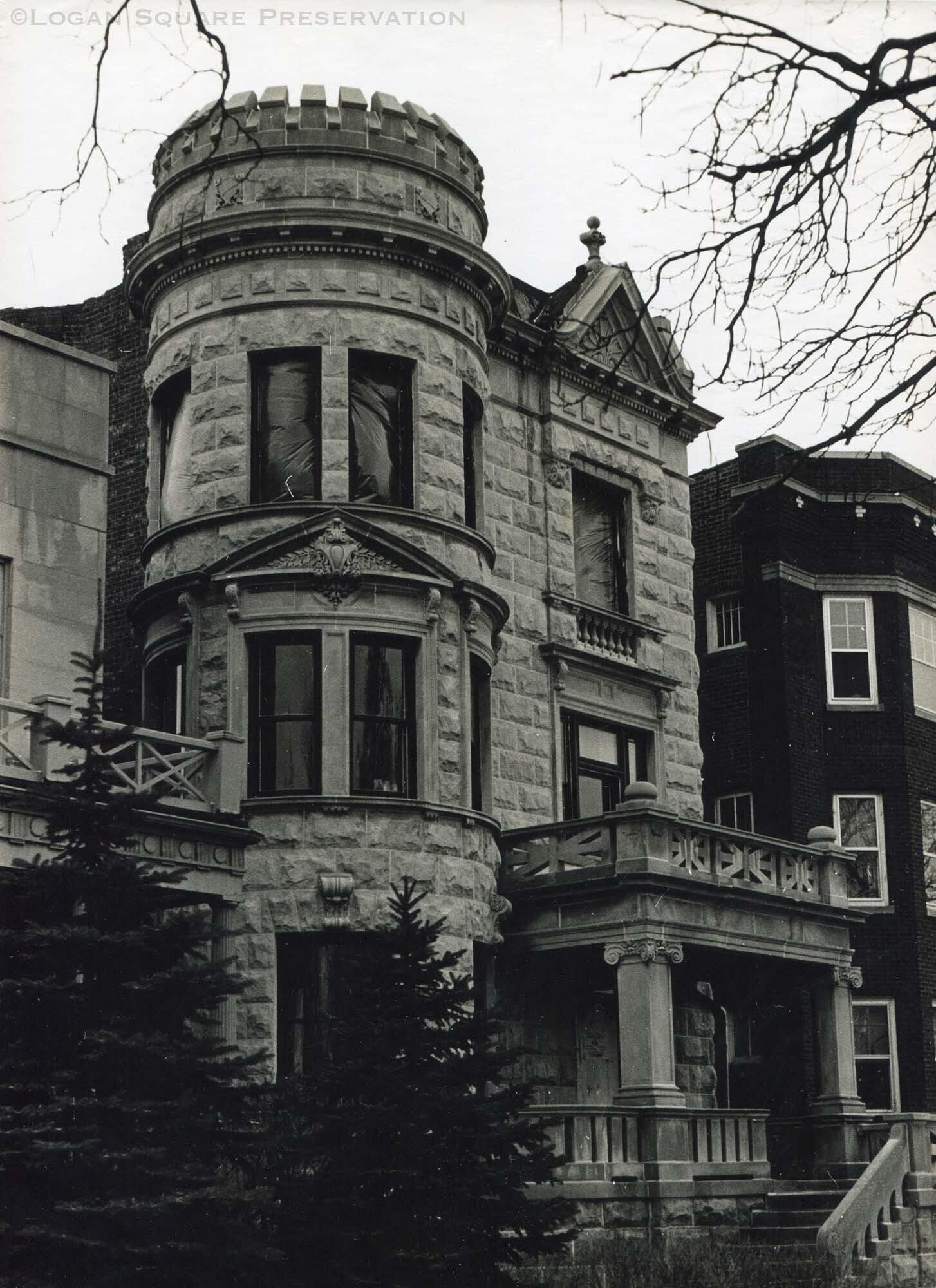 35mm b/w photo portrait of greystone mansion at 2819 W. Logan mounted on 11x13 illustration board, dated 3/79Photograph Details