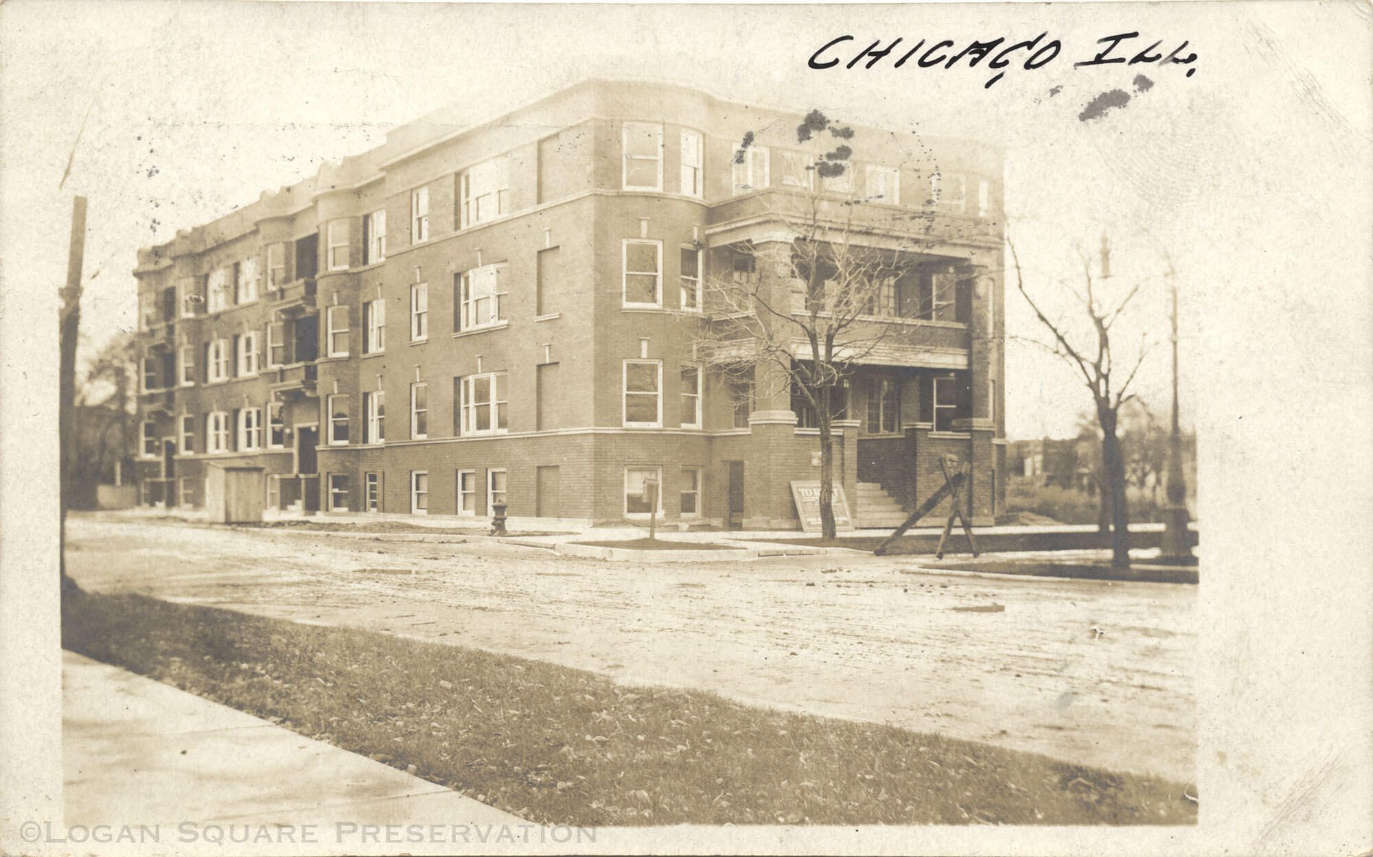 Real-photo postcard view looking southwest across Logan Blvd to new apartment building at 3001 W. Logan Blvd with For Rent sign in front, circa 1909Subject