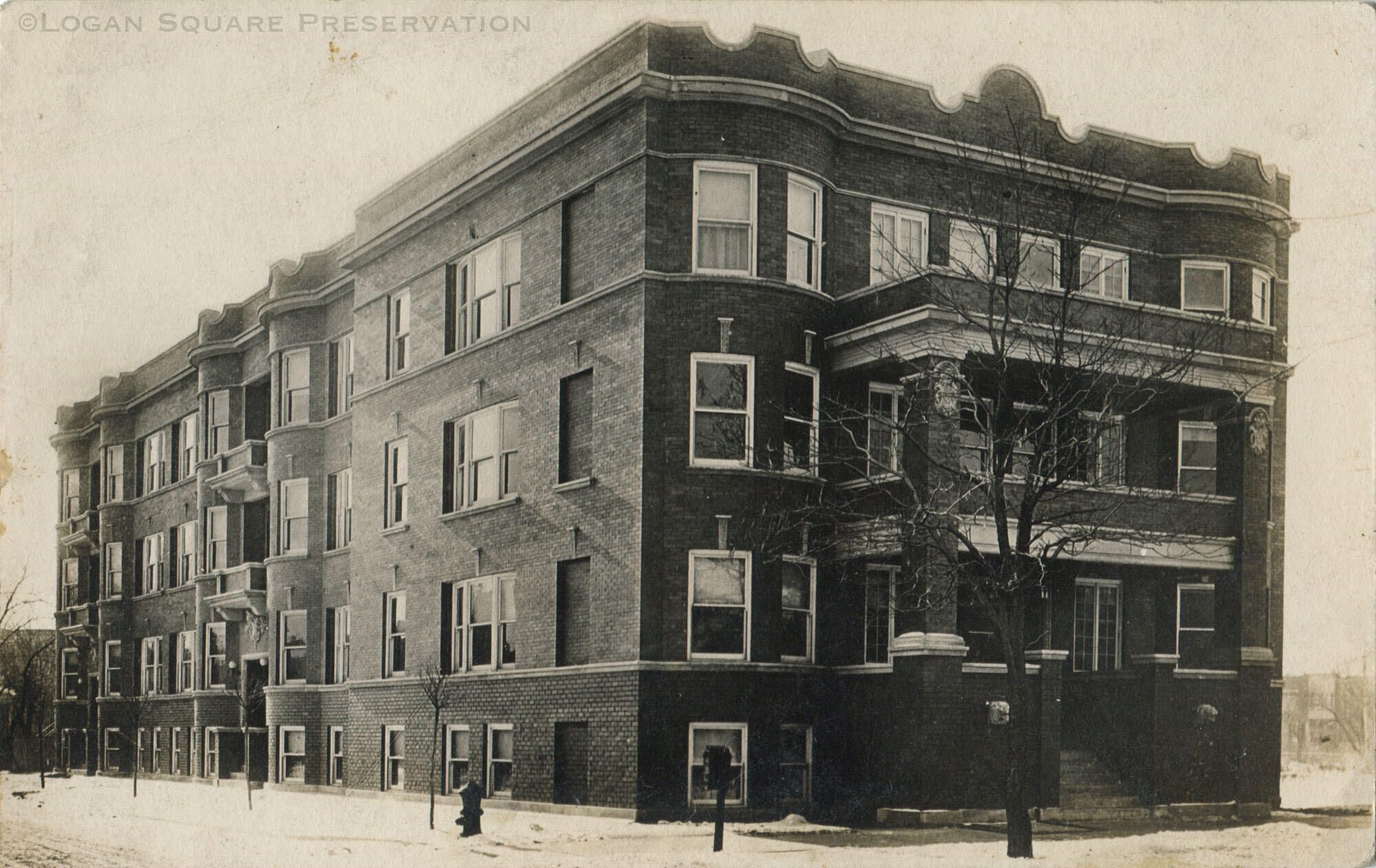 Real-photo postcard view of 3001 W. Logan Blvd apartments, circa 1910sSubject