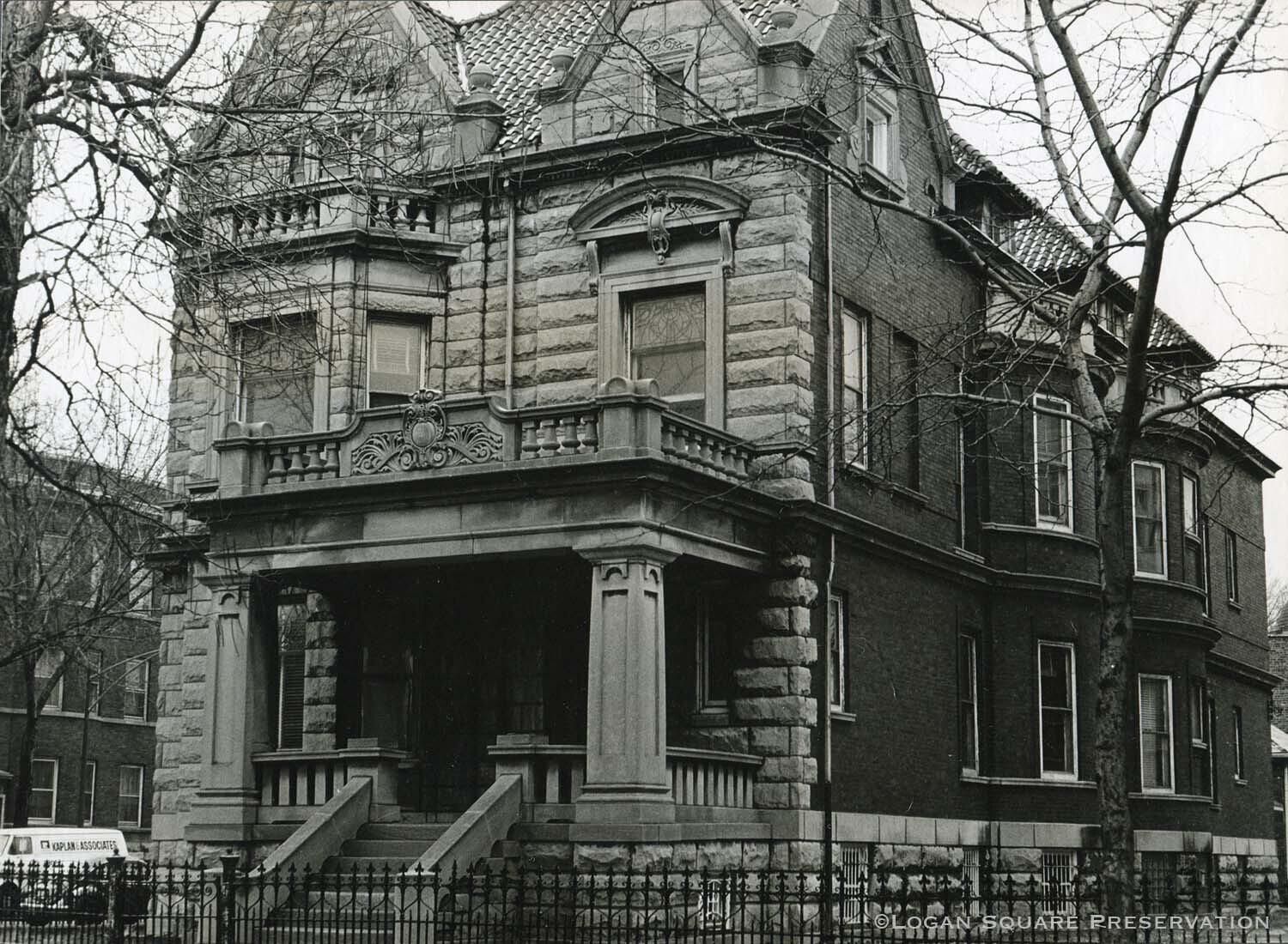 35mm b/w photo portrait of greystone mansion at 3024 W. Logan mounted on 11x13 illustration board, dated 3/79Photograph Details