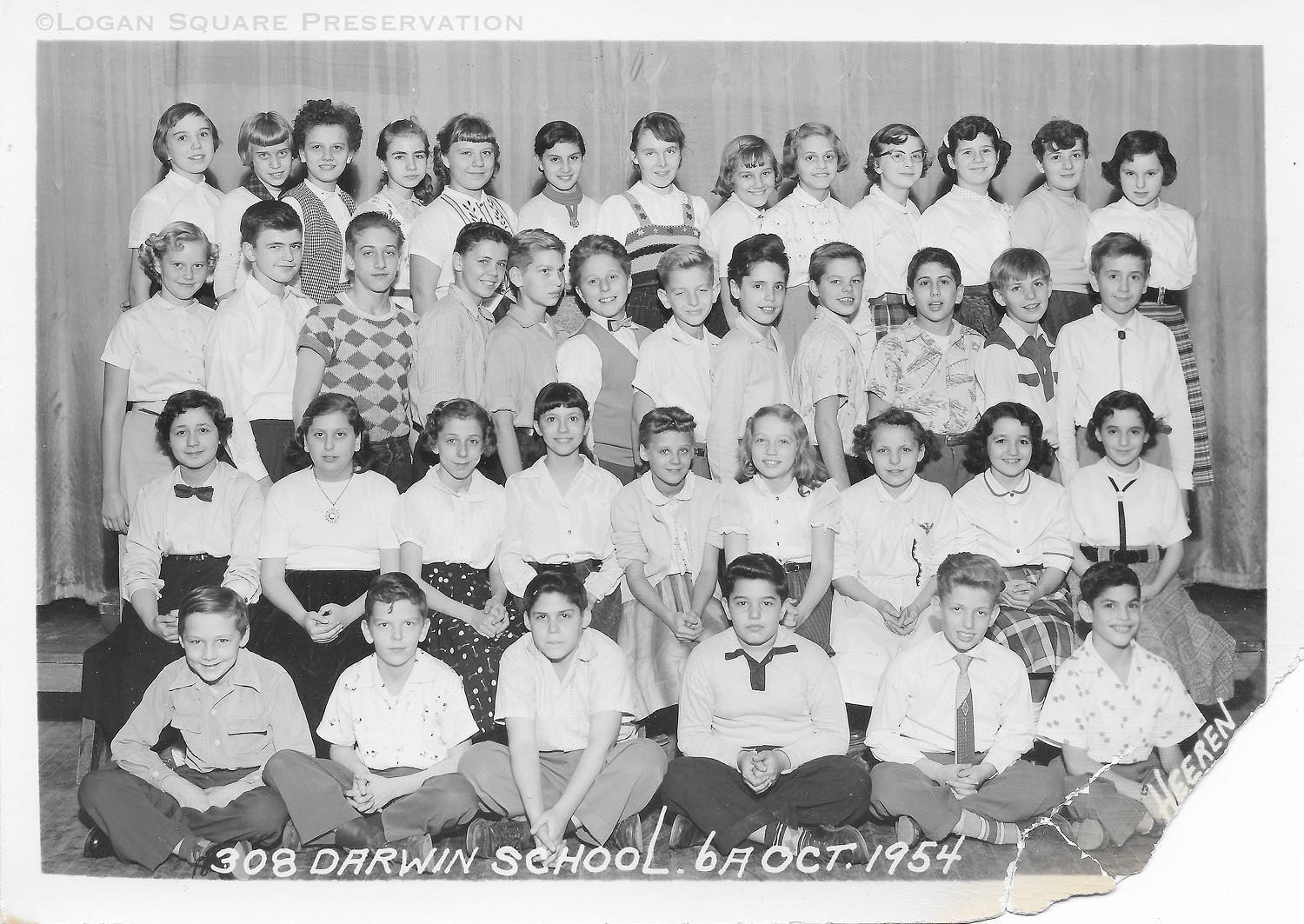 School class photo of sixth-grade class #308 at Darwin Elementary School, October 1954Photograph Details