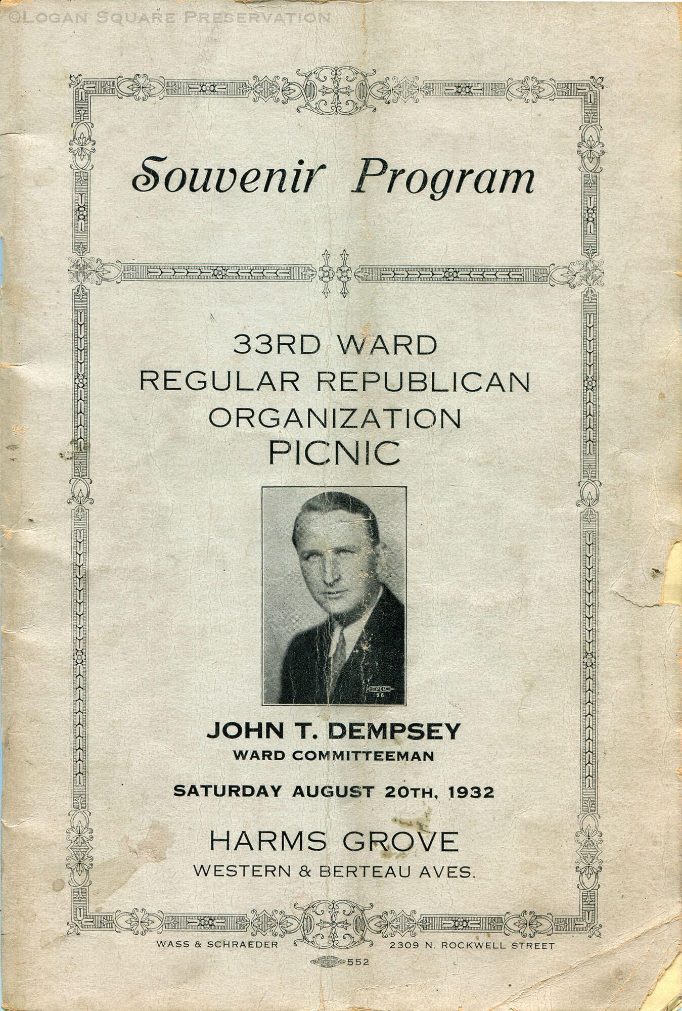 72-pg souvenir booklet for picnic at Harms Grove on Aug 20, 1932 given by 33rd Ward Republican committeeman John T. Dempsey. Includes local business ads.Publication Details