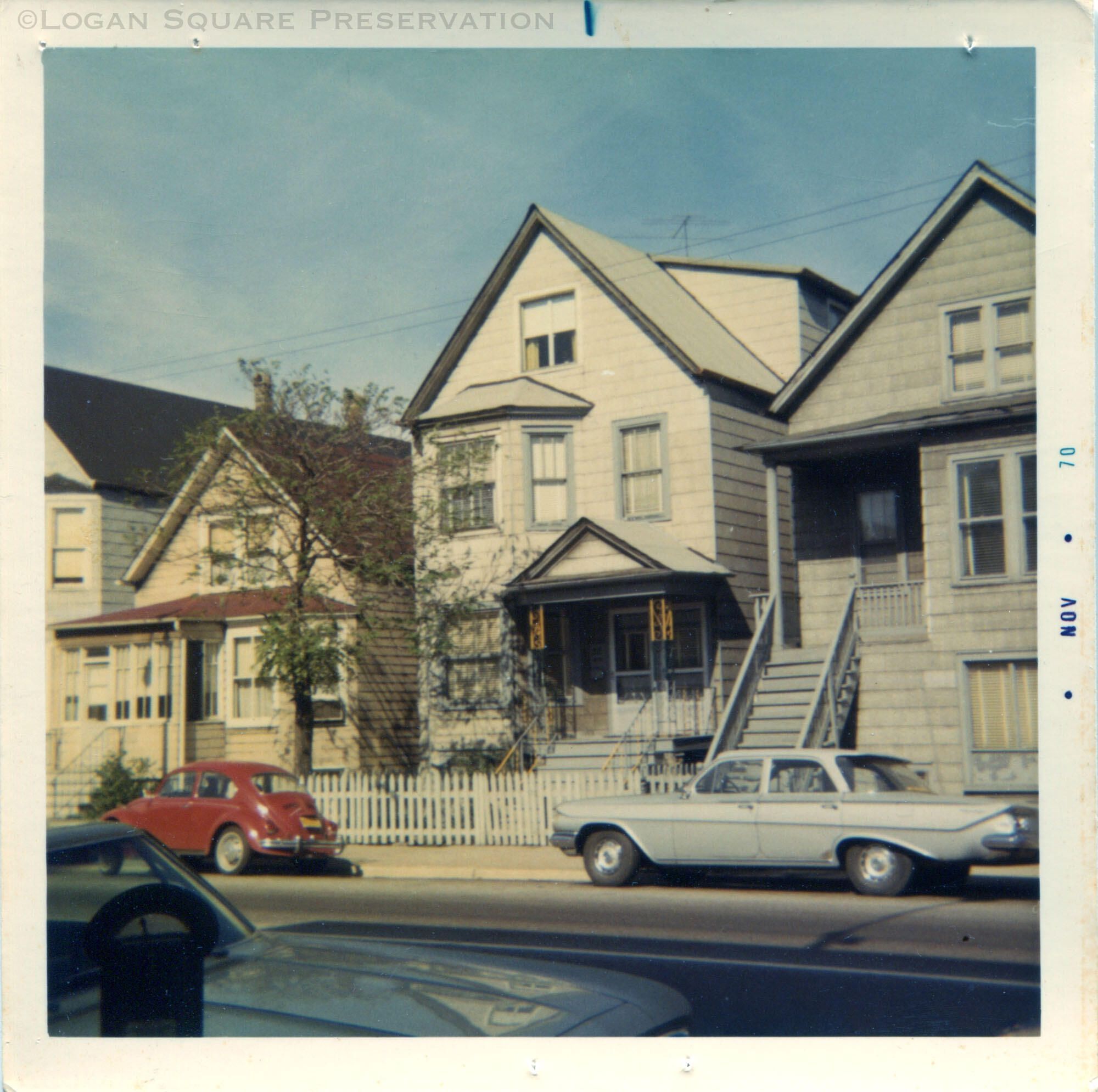 Snapshot photo of frame cottages and two-flat with picket fence and cars parked on Diversey Ave, 1970Photograph Details