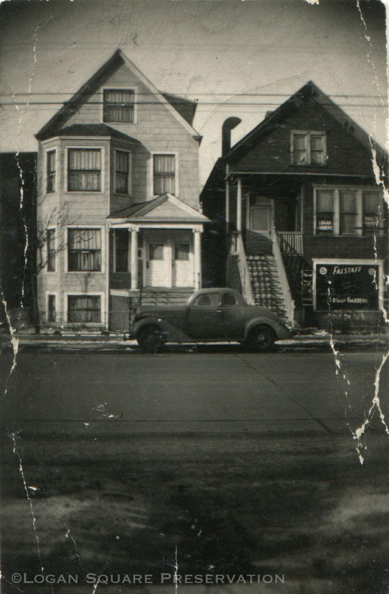 Small snapshot of 1940s coupe parked on Diversey Avenue in front of frame 2-flat and Logan Gardens tavern, circa 1940sPhotograph Details