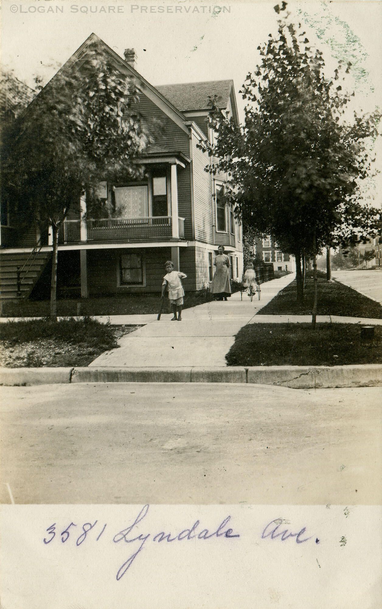 Real-photo postcard view looking southeast at child with baseball bat and child on trike with woman in front of frame house with porch at corner of Lyndale and Central Park Ave, circa 1910Subject Place