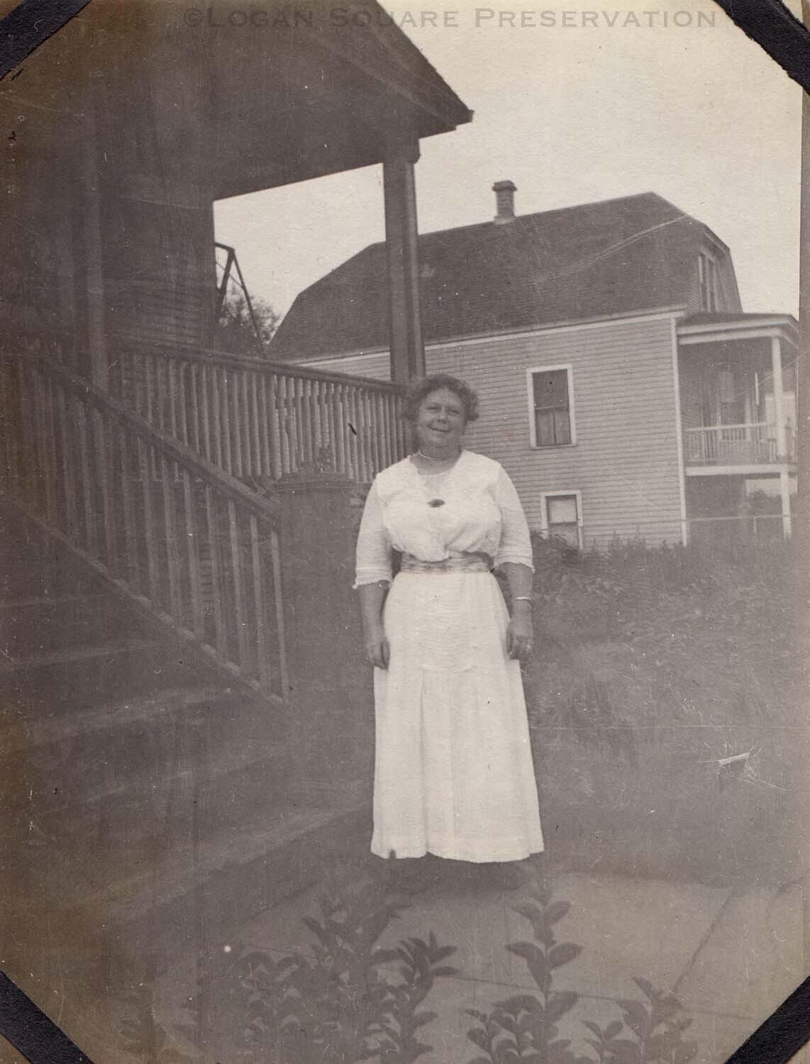Snapshot portrait of woman (possibly Eleanor Percival) standing near front steps to two-flat at 3719 W. McLean, circa 1915Photograph Details