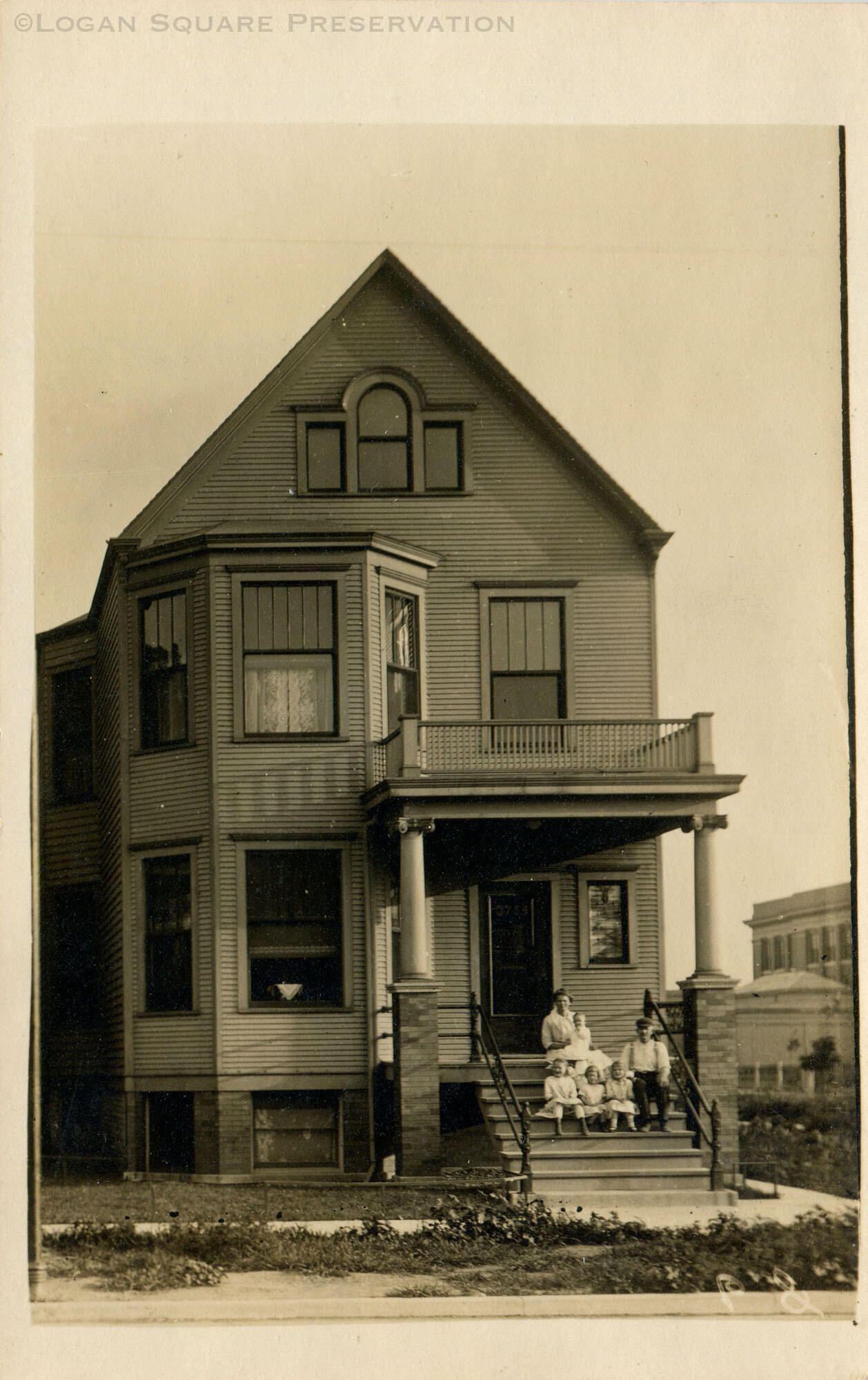 Real photo postcard view of family with four children sitting on steps of 2-story frame house at 3755 Belden built 1910 by carpenter Frank Henriksen, taken July 29, 1913Subject Place