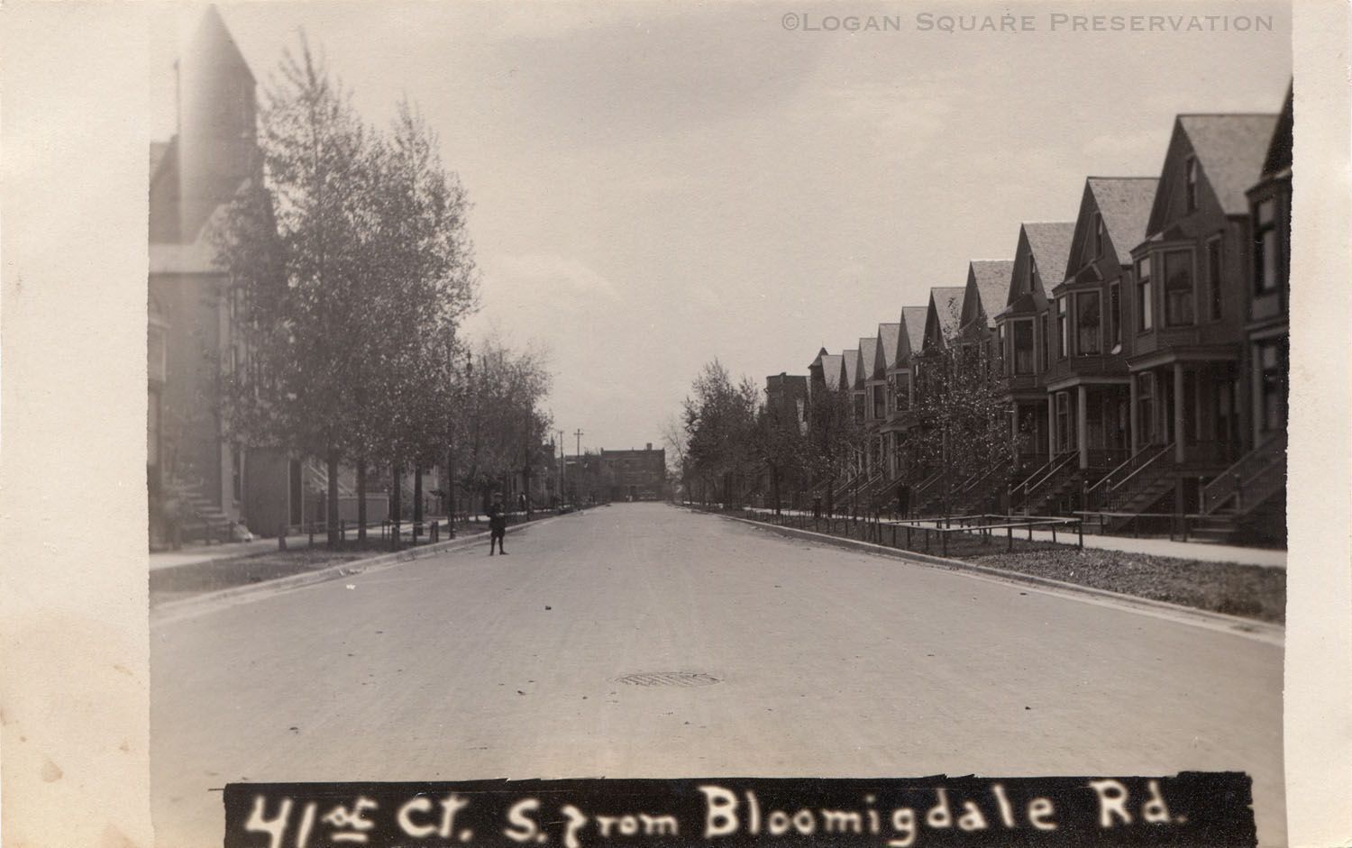 Real-photo postcard view looking south at row of frame two-flats on 1700 N. block of Kedvale Ave (formerly 41st Court) south of Bloomingdale Line tracks (now 606 trail), circa 1910Subject Person/Organization