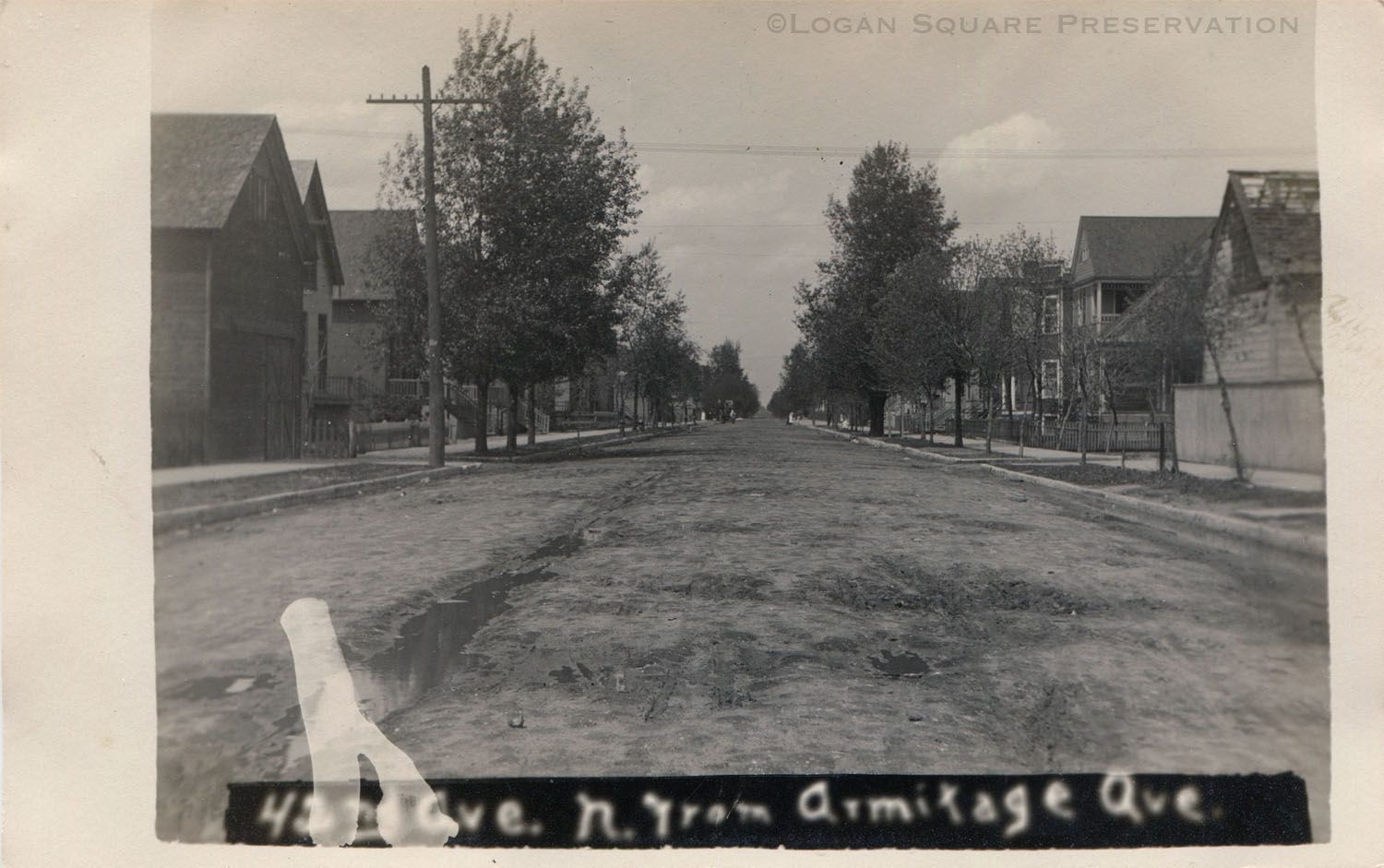 Real-photo postcard view looking north at frame houses and two-flats on 2000 N. block of Keeler Ave (formerly 42nd Ave), circa 1910Subject Place