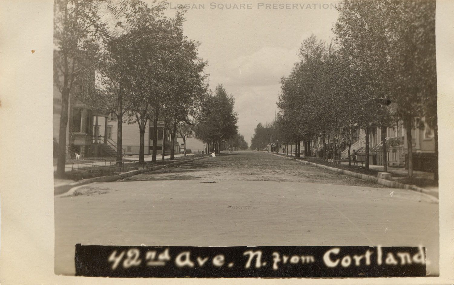 Real-photo postcard view looking north at houses and two-flats behind trees on 1900 N. block of Keeler Ave (formerly 42nd Ave), circa 1910Subject Place
