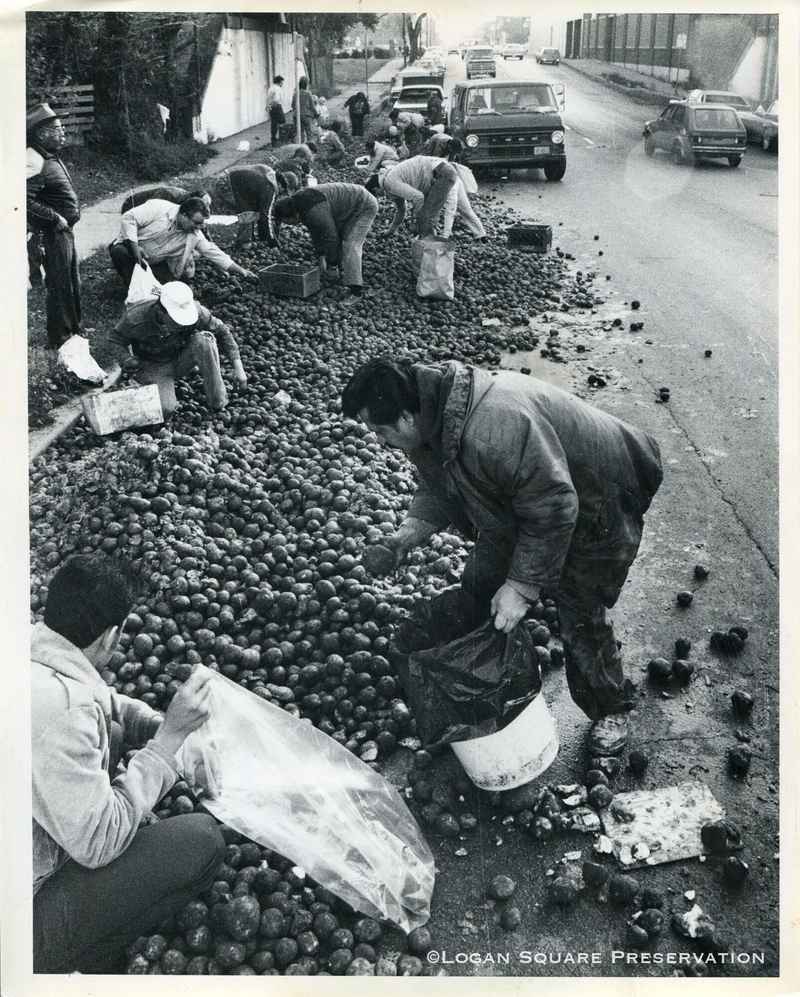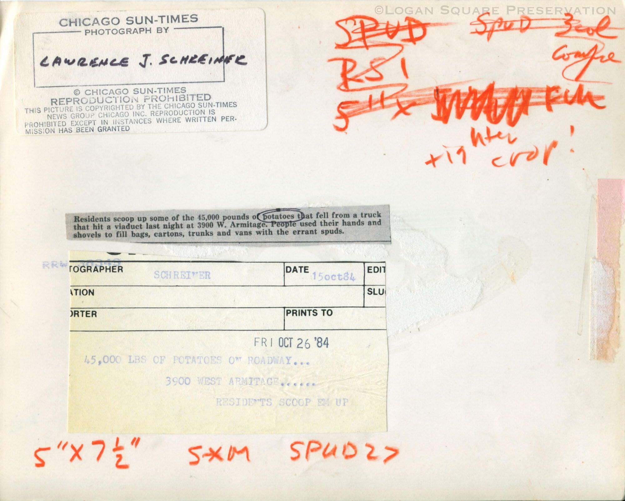 News photo view of gleaners picking up potatoes spilled from truck which hit railroad viaduct on evening of Oct 14, 1984. Corner of Admiral Electronics factory visible in distance on right.Photograph Details