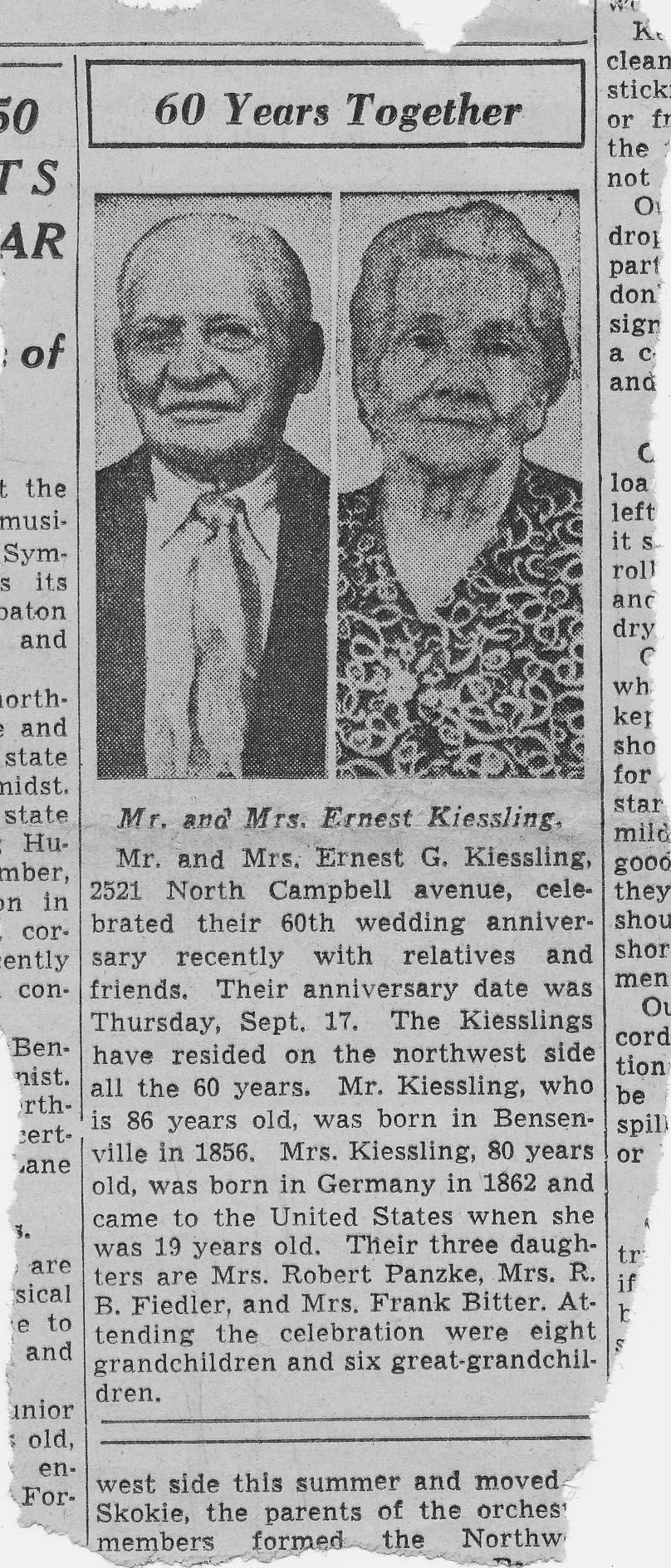 Newspaper clipping torn from Oct 4, 1942 Chicago Tribune with portrait of Ernst & Ida Kiessling on celebrating their 60th wedding anniversaryCollection