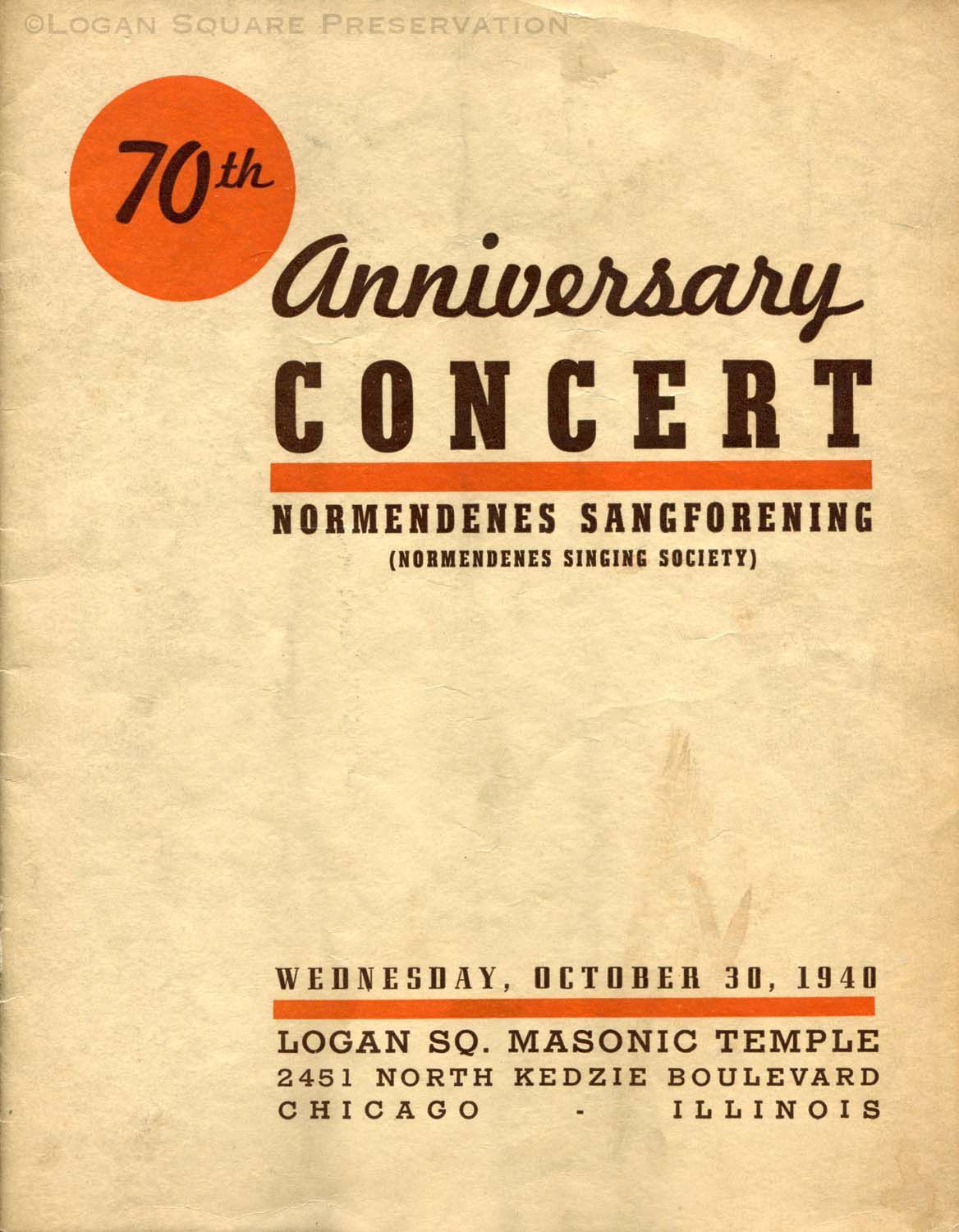 28-pg souvenir program booklet from October 30, 1940 concert at Logan Square Masonic Temple by Normendenes Singing Society. Includes history of group, photos of club house exterior and interior, local business adsCollection