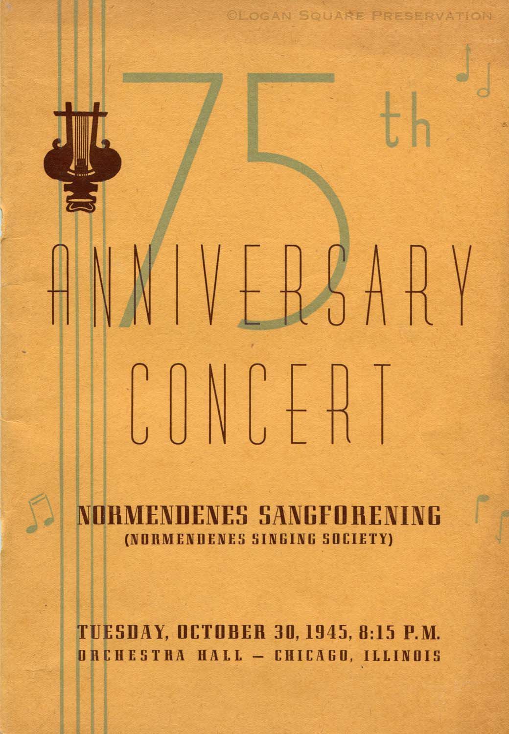 52-pg souvenir program booklet from Oct 30, 1945 choral concert at Orchestra Hall celebrating 75th anniversary of founding of Normendenes Sangforening. Includes photos of choir, local business ads.Collection