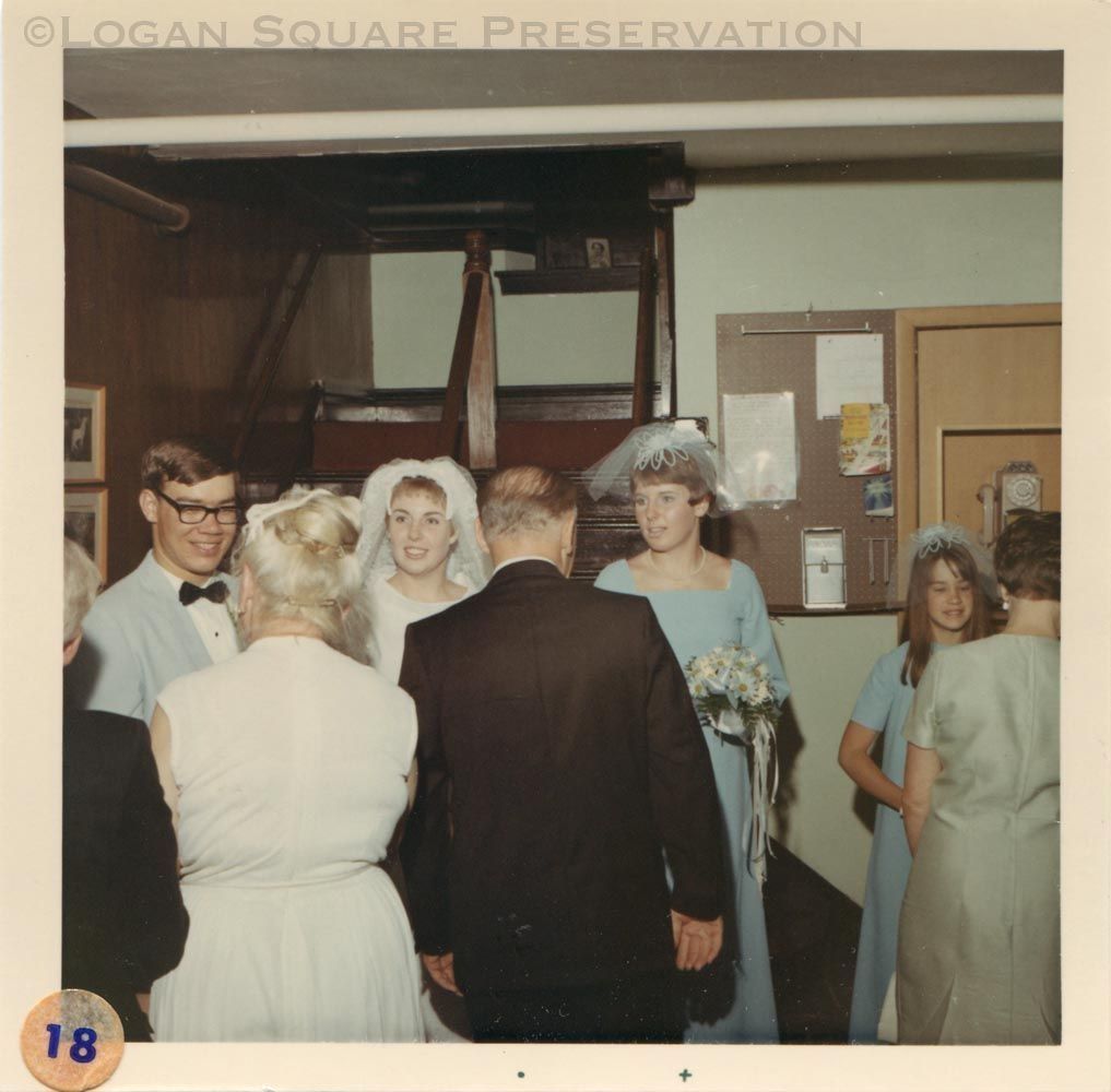 Photo of bride and groom in reception line greeting Norma Altern-Samuel Smith wedding guests in foyer of Minnekirken, 1968Photograph Details