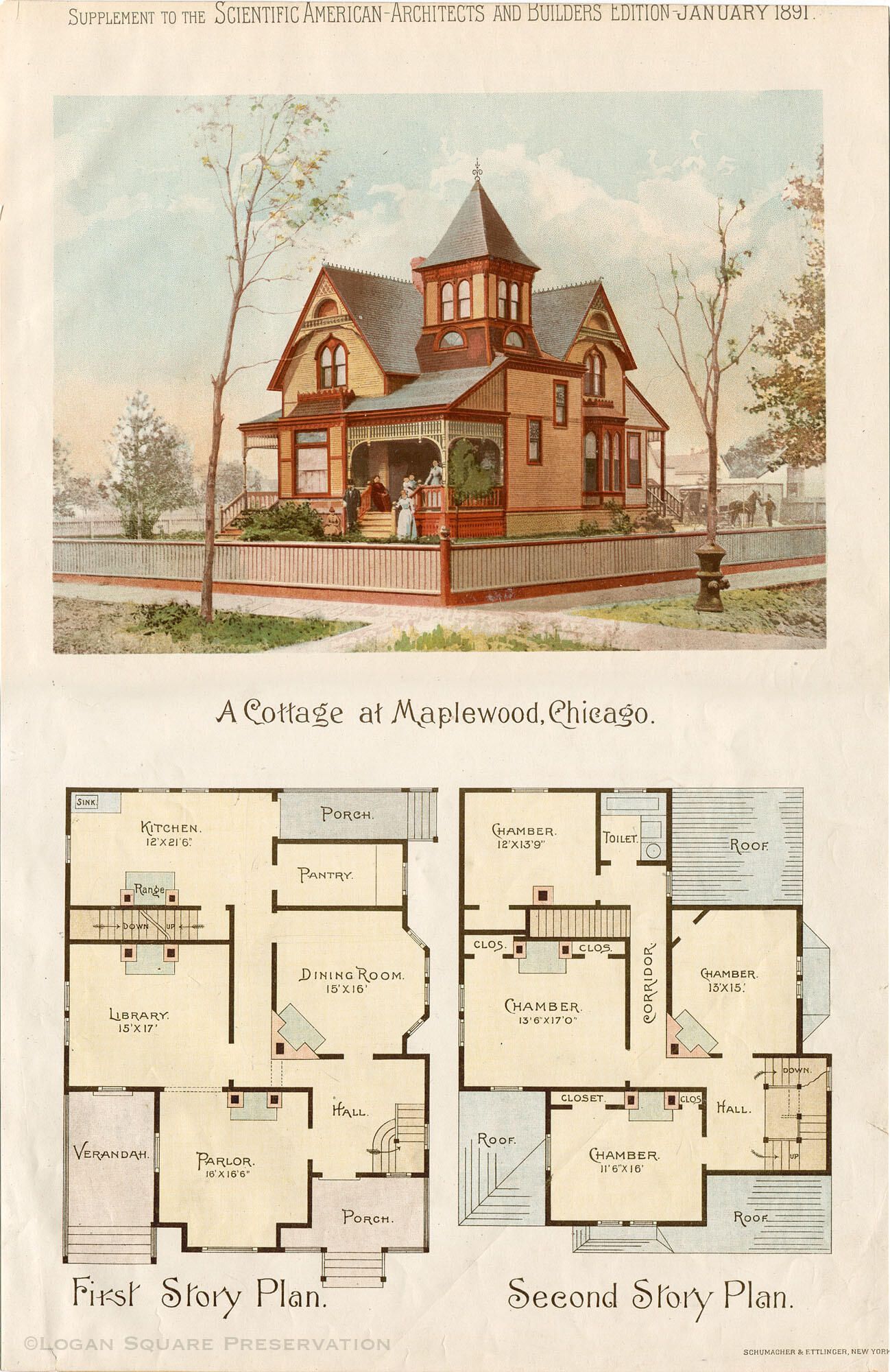 Color lithograph illustration and floor plan of Queen Anne-style wood frame house with tower built for furniture-maker Anton Peterson circa 1887. Sheet from art supplement to Scientific American Architects and Builders Edition, January 1891Publication Details