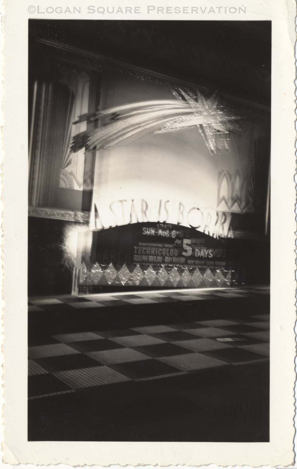 Snapshot photo of lighted display advertising 5-day run of film "A Star is Born" in lobby of Logan Theater, August 1937Photograph Details