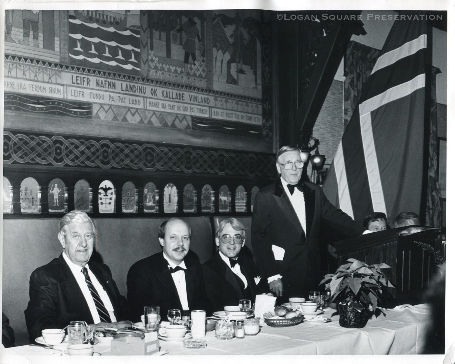 Photograph of head table at Herremiddag dinner with Irv Highland, organizers Rob Alsaker and Chris Johansen standing at lectern in front of Leif Erickson mural by Emil Biorn in ballroom at Norske Klub, Dec 7, 1984Photograph Details