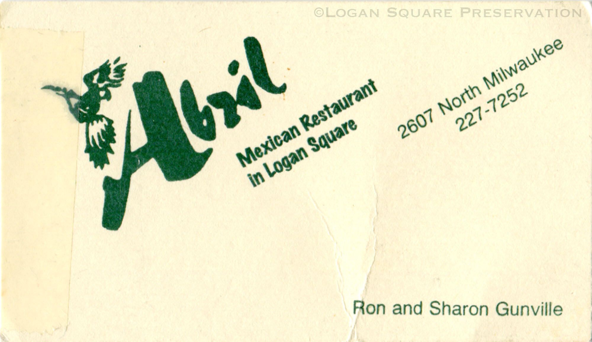 Business card from Ron and Sharon Gunville of Abril restaurant in green ink on cream paper, circa 1970s-80sCollection