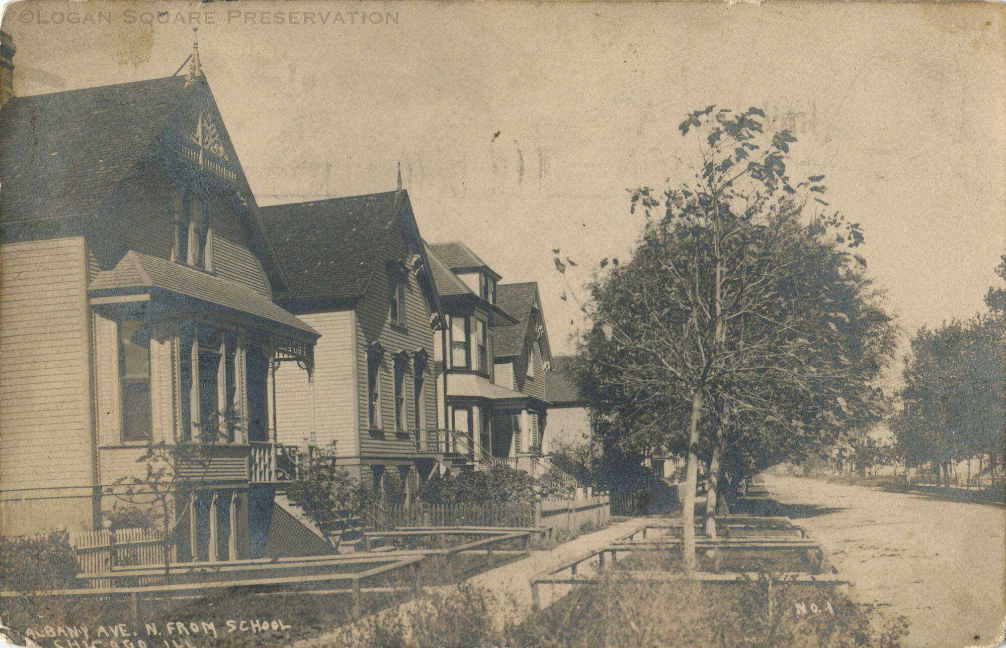 Real-photo postcard view looking north at frame houses on west side of 3300 block of N. Albany Ave, circa 1908Subject