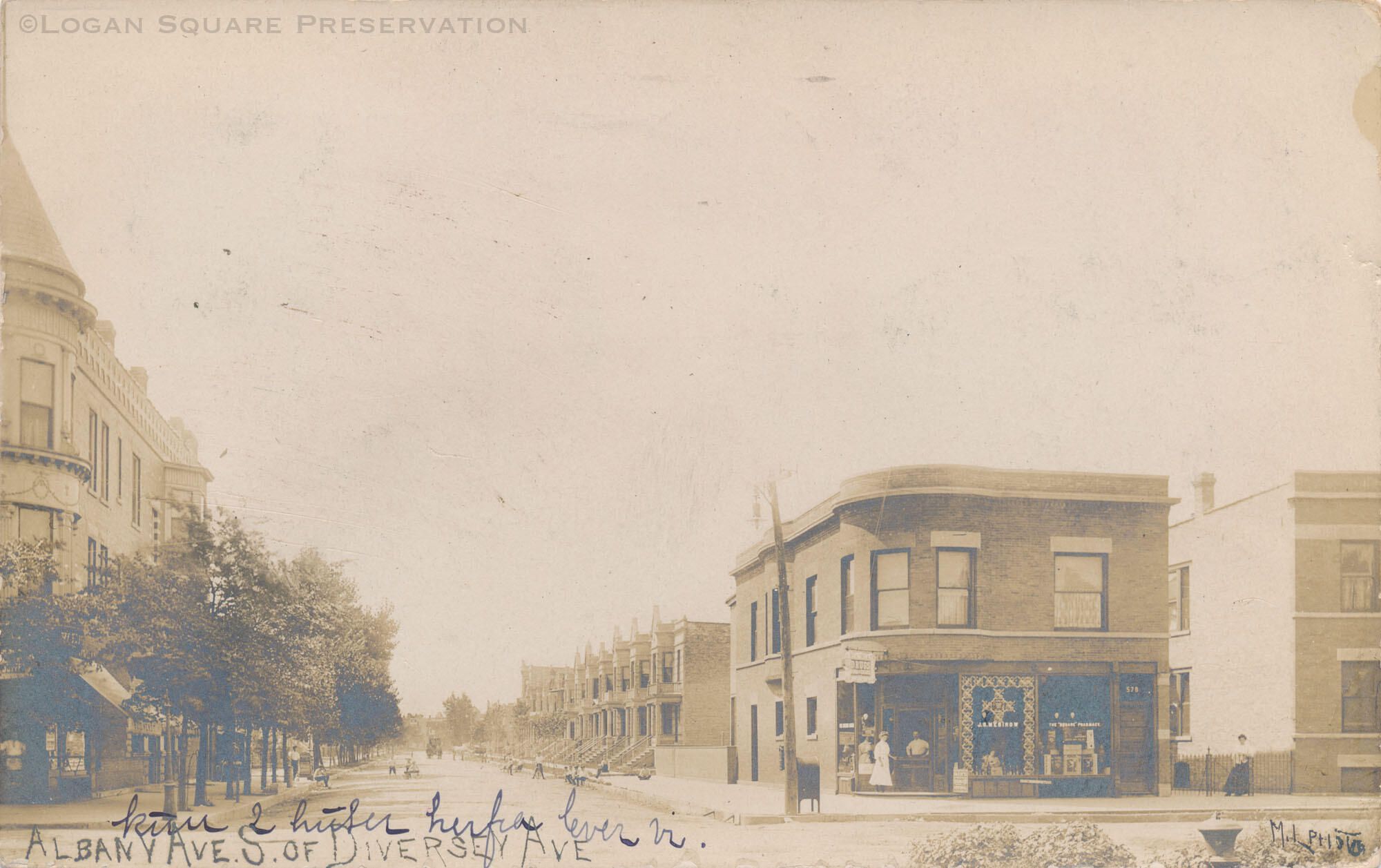Real-photo postcard view looking south at J.S. Mesirow "The Square" Pharmacy on corner of Albany & Diversey and greystone 2-flats farther down 2700 block of N. Albany Ave, circa 1908Subject