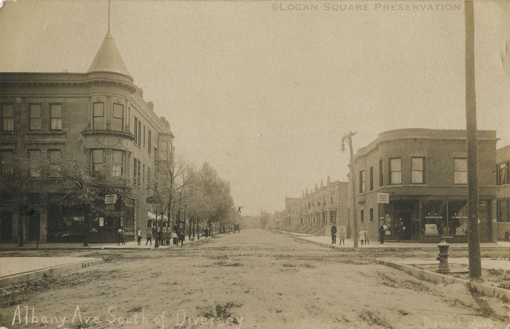 Real-photo postcard view looking south on Albany Ave from Diversey between Rudolph Wendt saloon and Minchin pharmacy, circa 1908. House at far end of block marked with "X"Subject Person/Organization