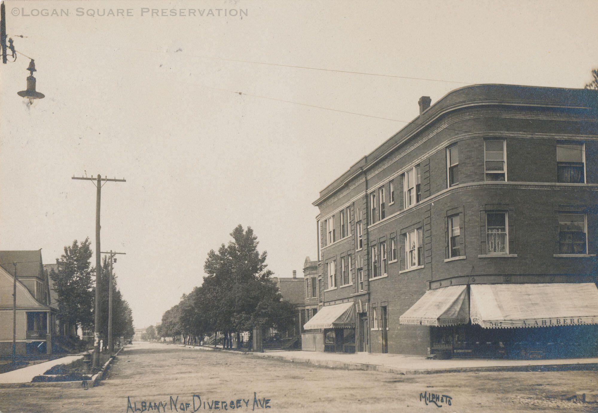 Real-photo postcard view of Albany Avenue north of Diversey and A. Ahlberg grocery on northeast corner, circa 1909Subject Person/Organization