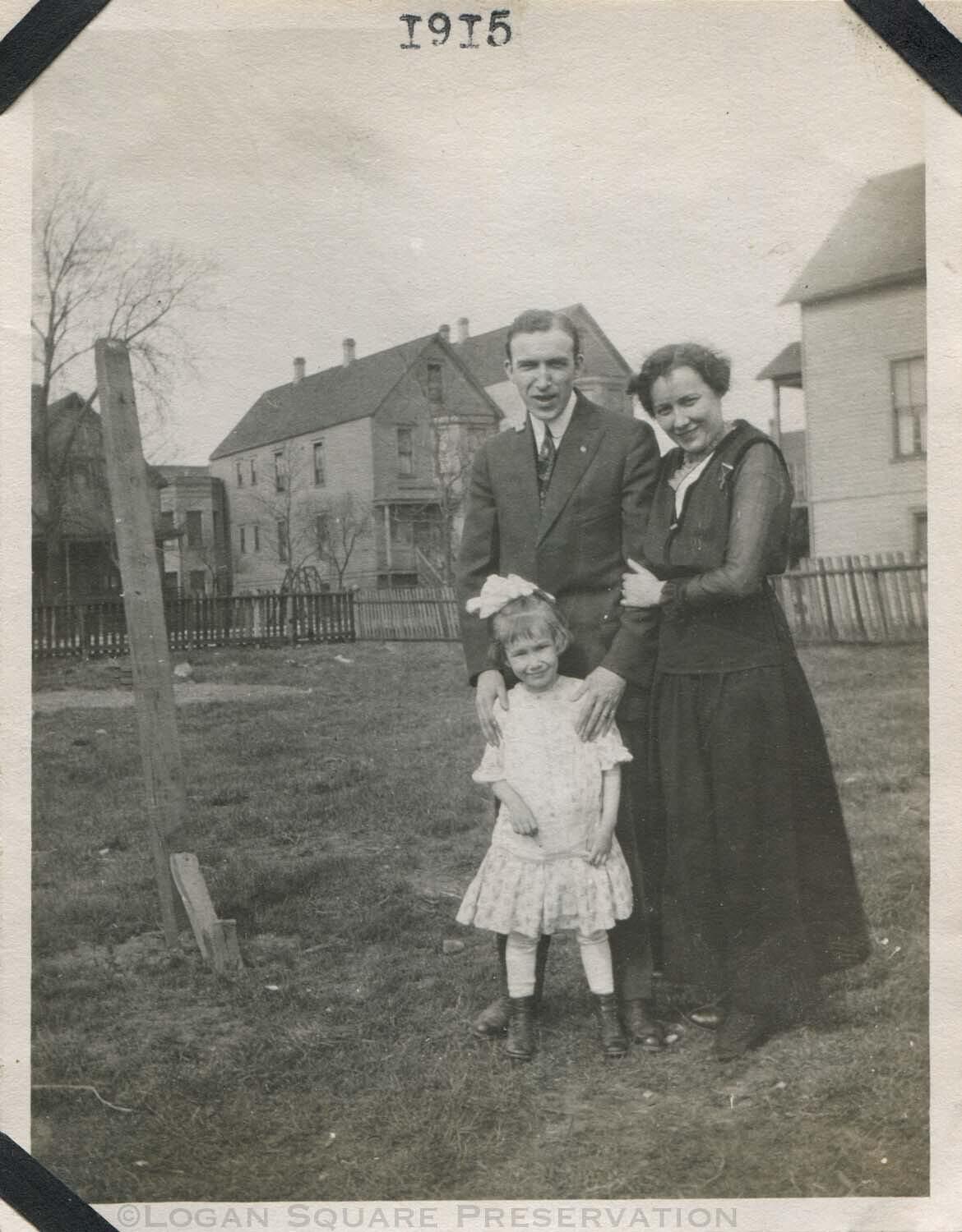 Snapshot photo of Albert & Irene Percival and their 6-yr old daughter Jane in side yard of home at 3719 W. McLean looking north at houses along McLean Ave, 1915Photograph Details