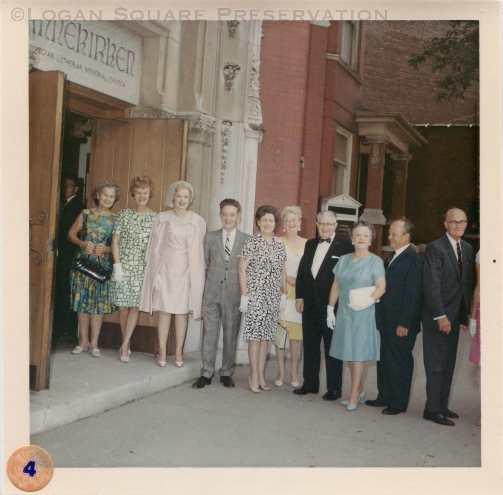 Photo of wedding guests standing in line outside door of Minnekirken, 1968Photograph Details